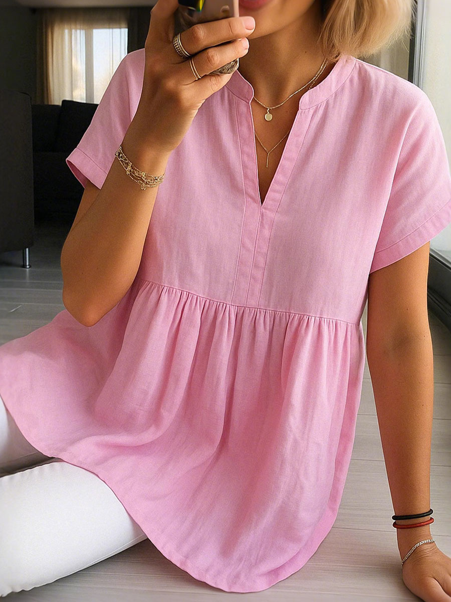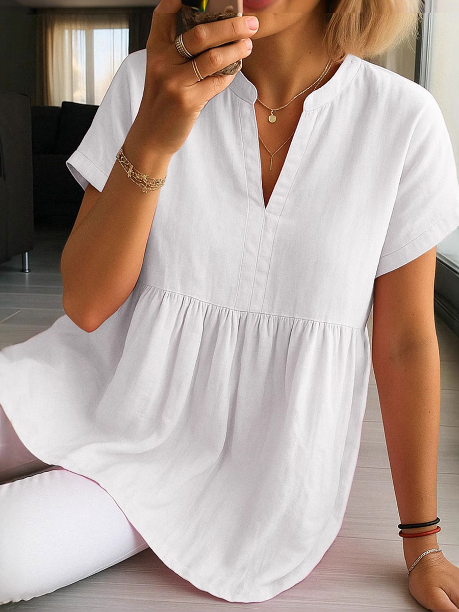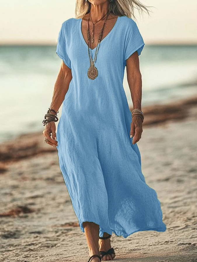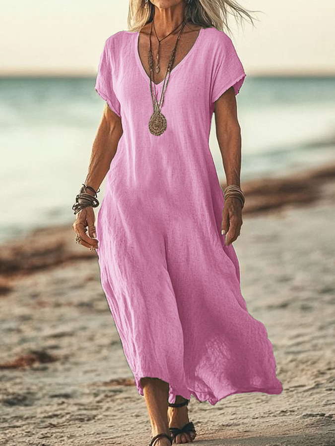 Vestido suelto de manga corta con cuello en V de algodón y lino para mujer