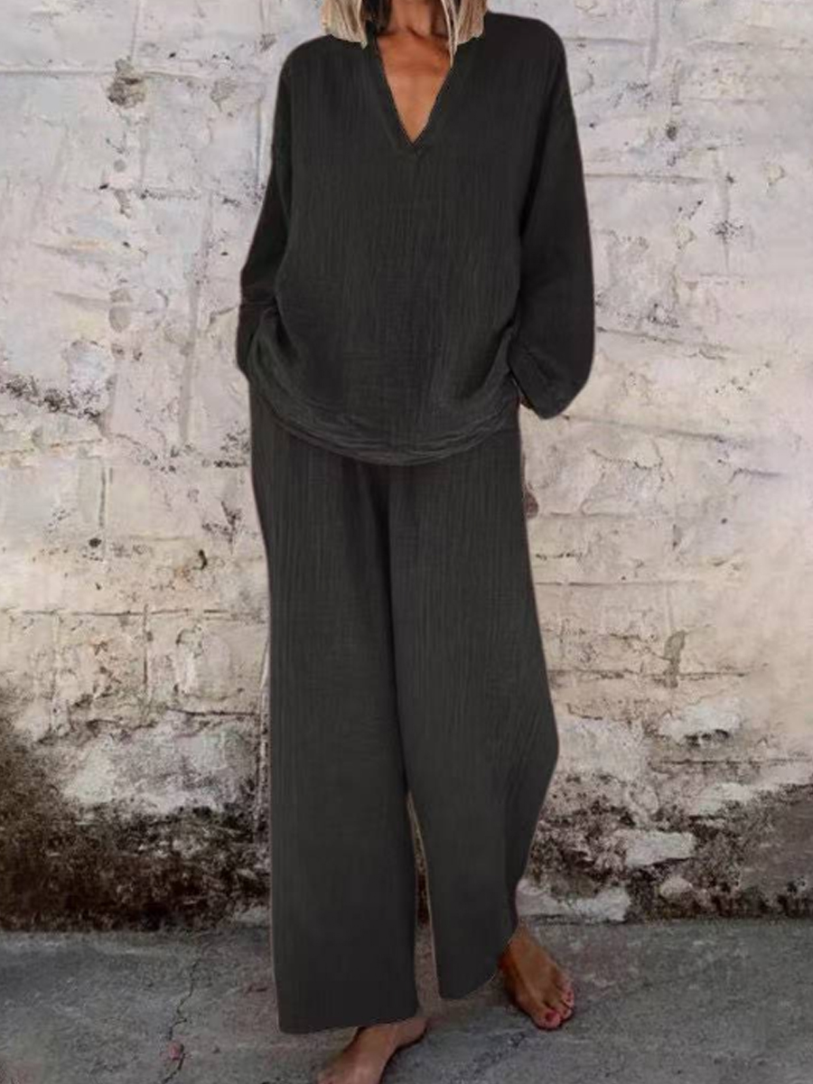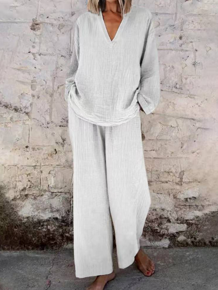 Traje de dos piezas de algodón y lino de color sólido para mujer