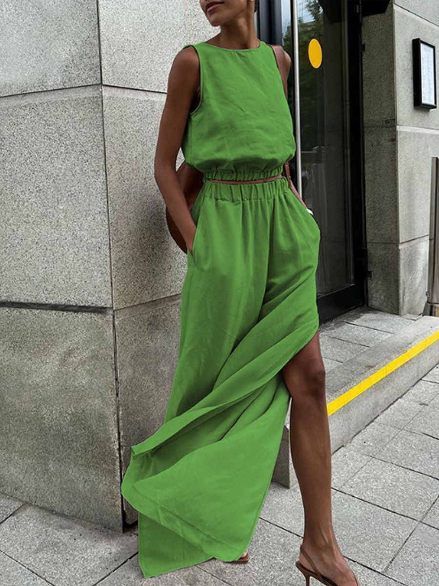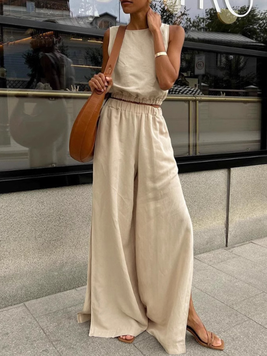 Traje de dos piezas de algodón y lino de color sólido para mujer con pantalones divididos