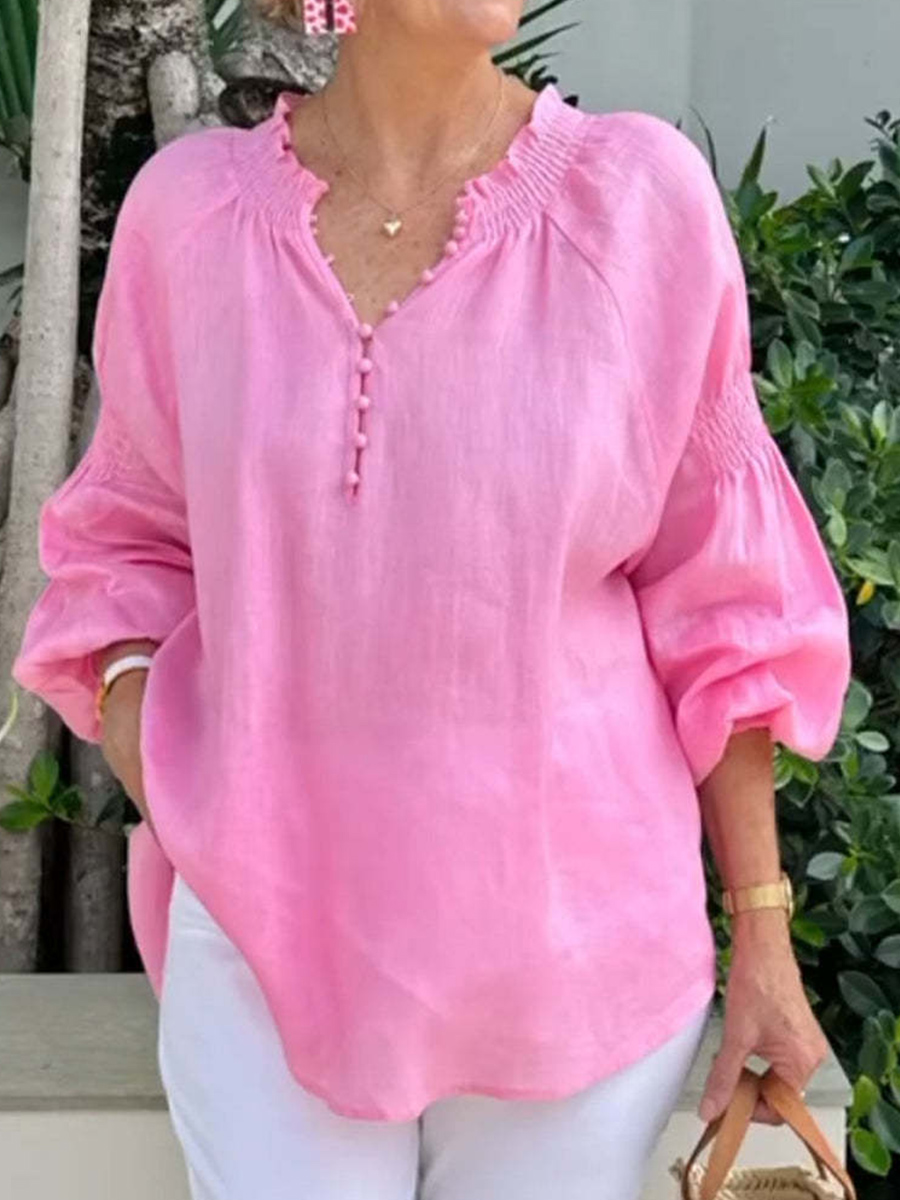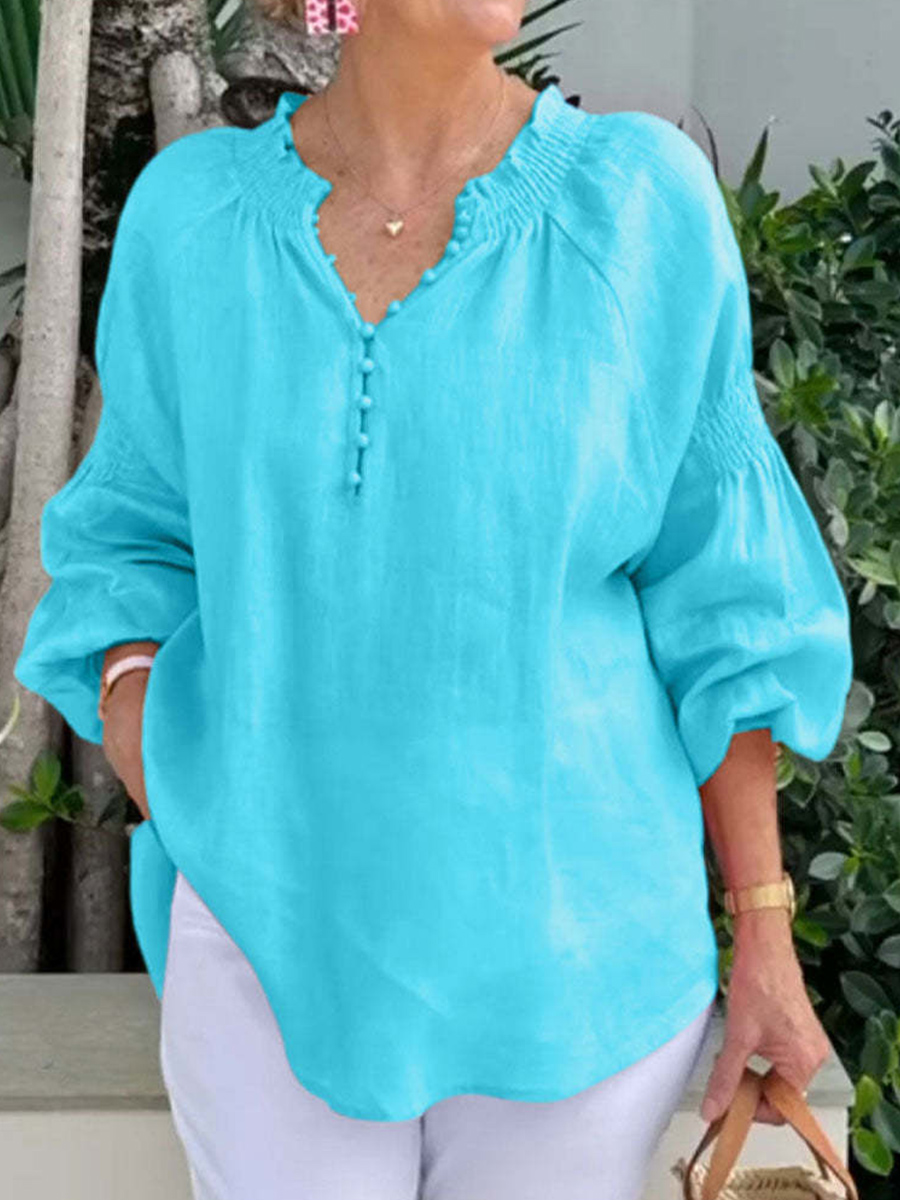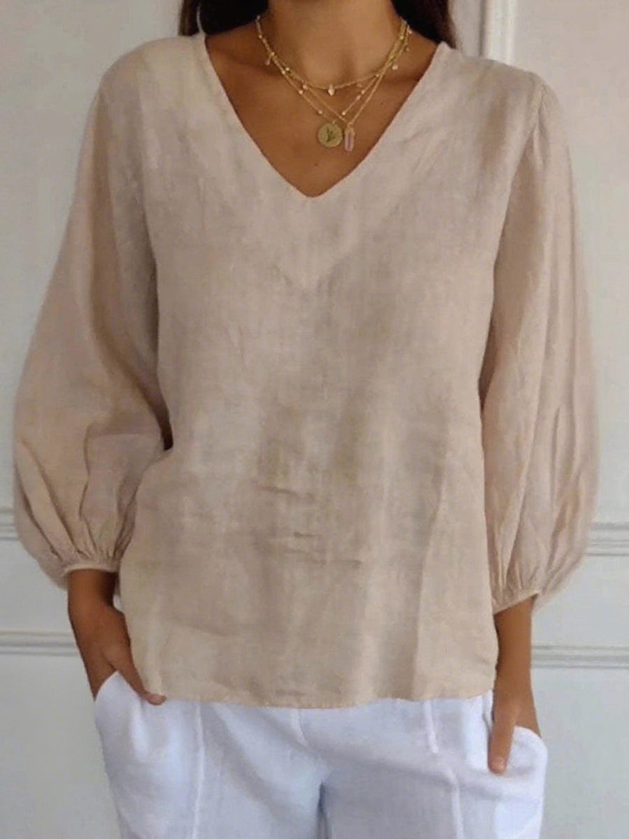 Camisa de lino sólido simple con cuello en V para mujer