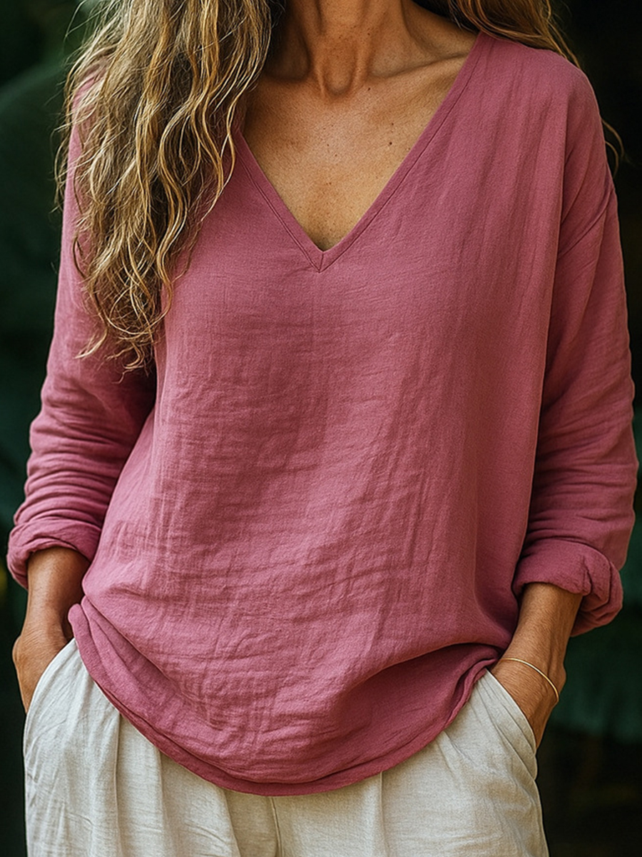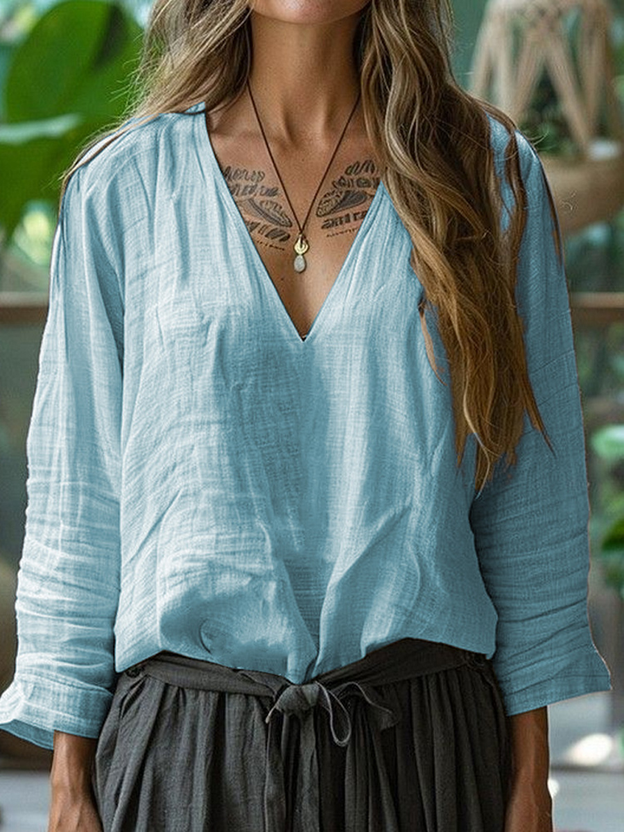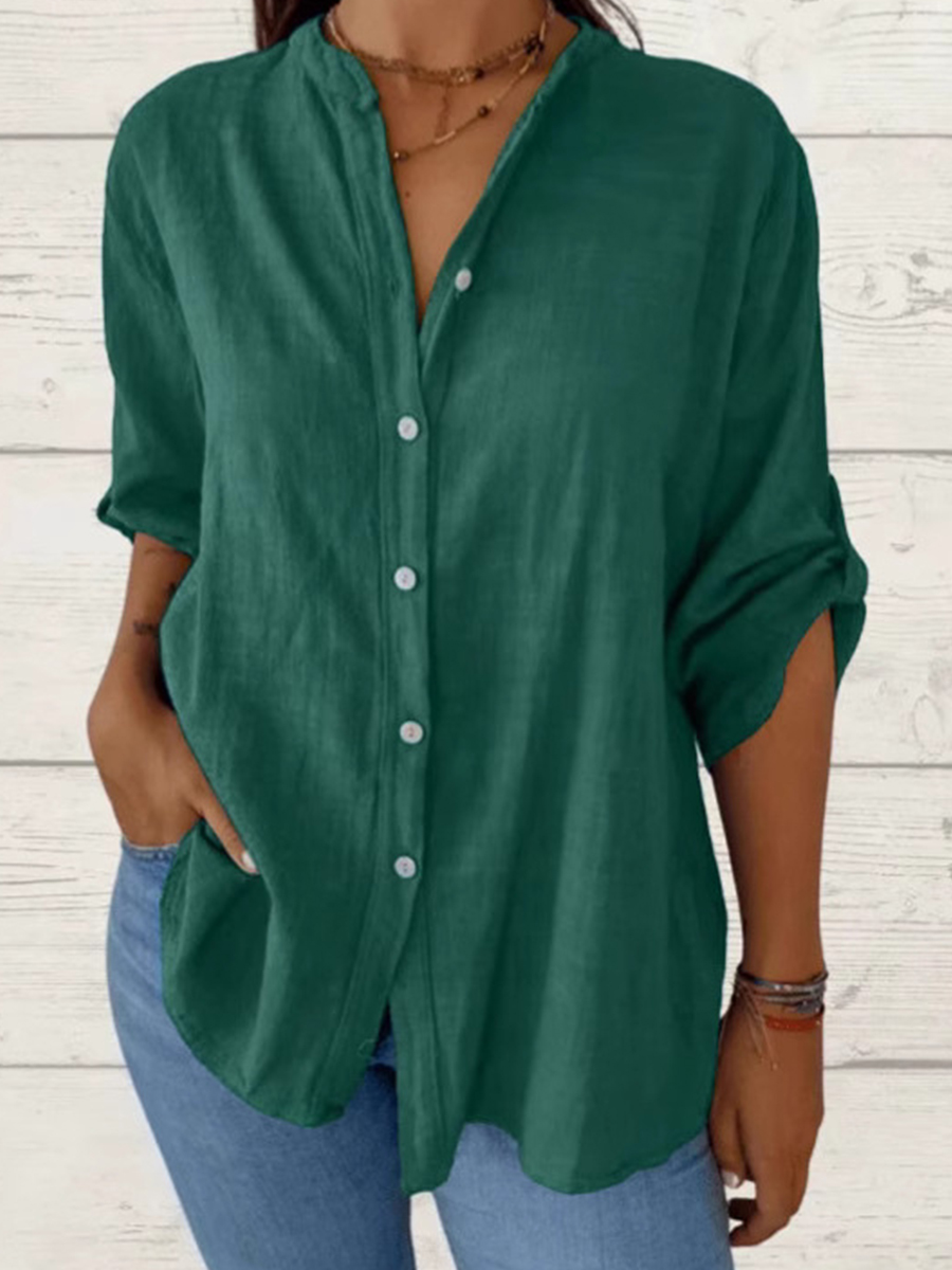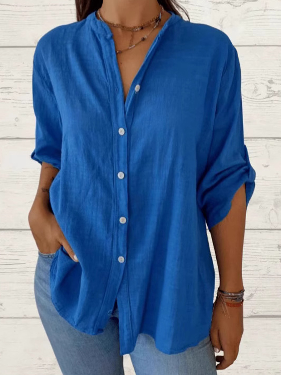 Camisa simple de lino con cuello en V de color sólido para mujer