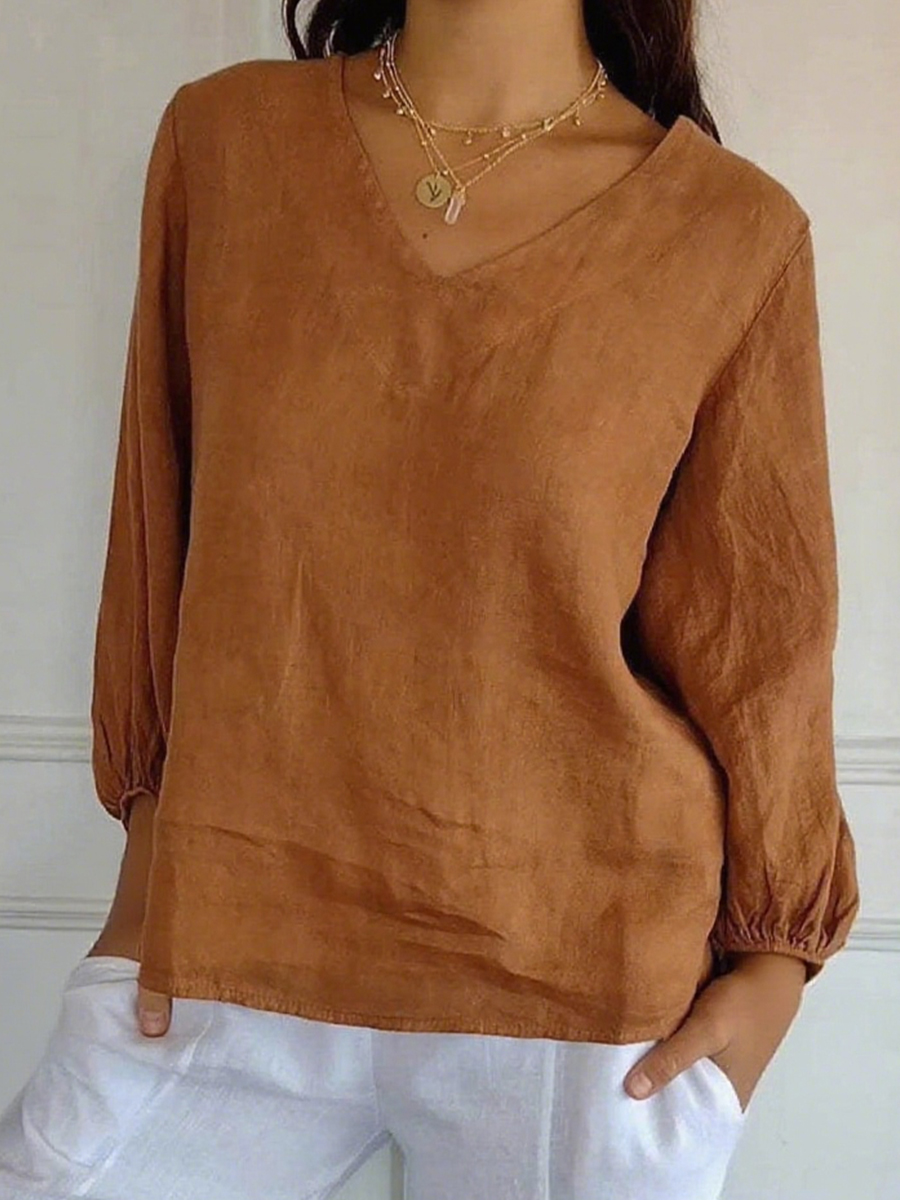 Camisa de cuello en V de lino de color sólido simple para mujer