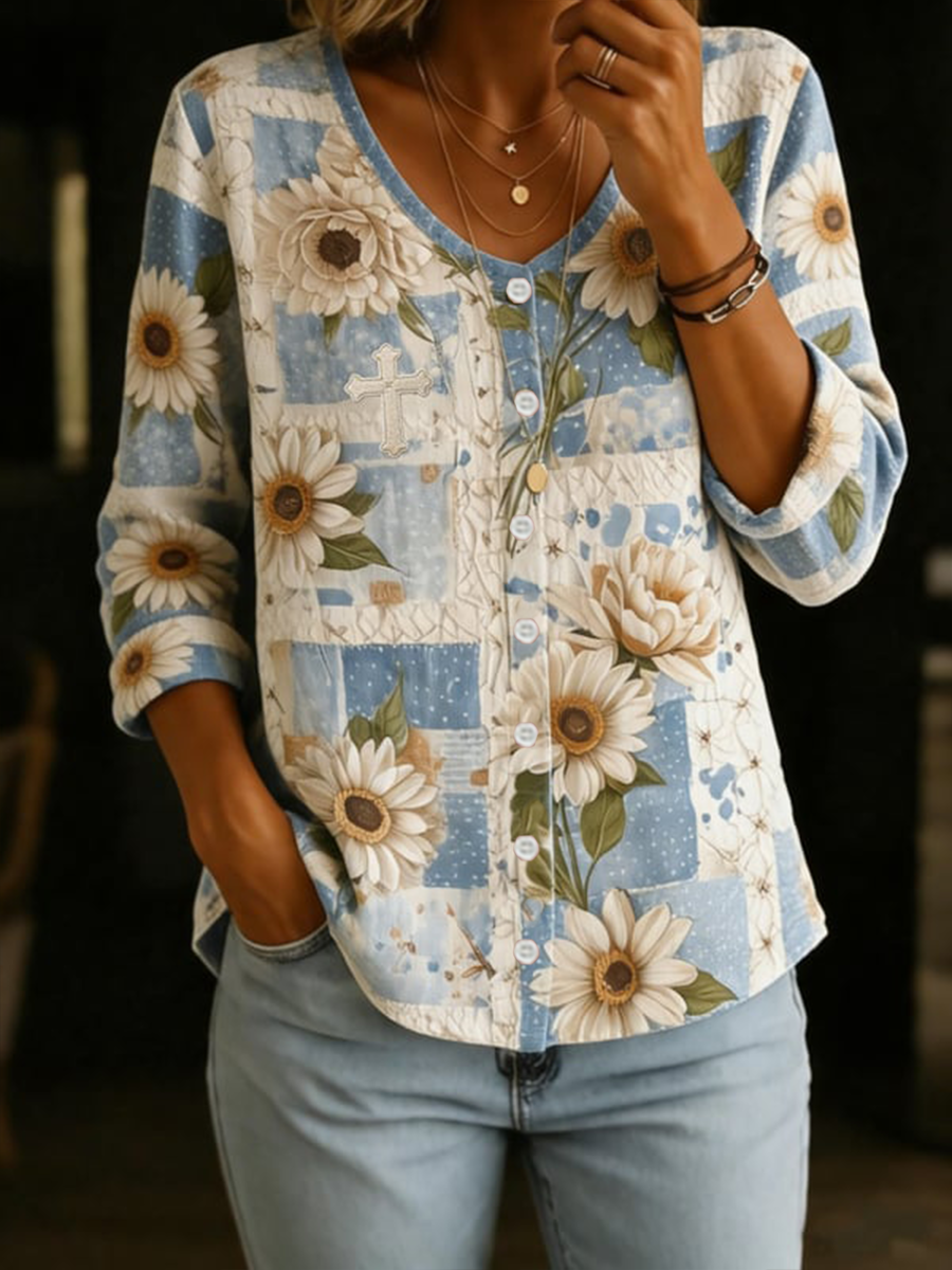 Camisa de mujer de algodón-lino con estampado floral, cuello en V y botones