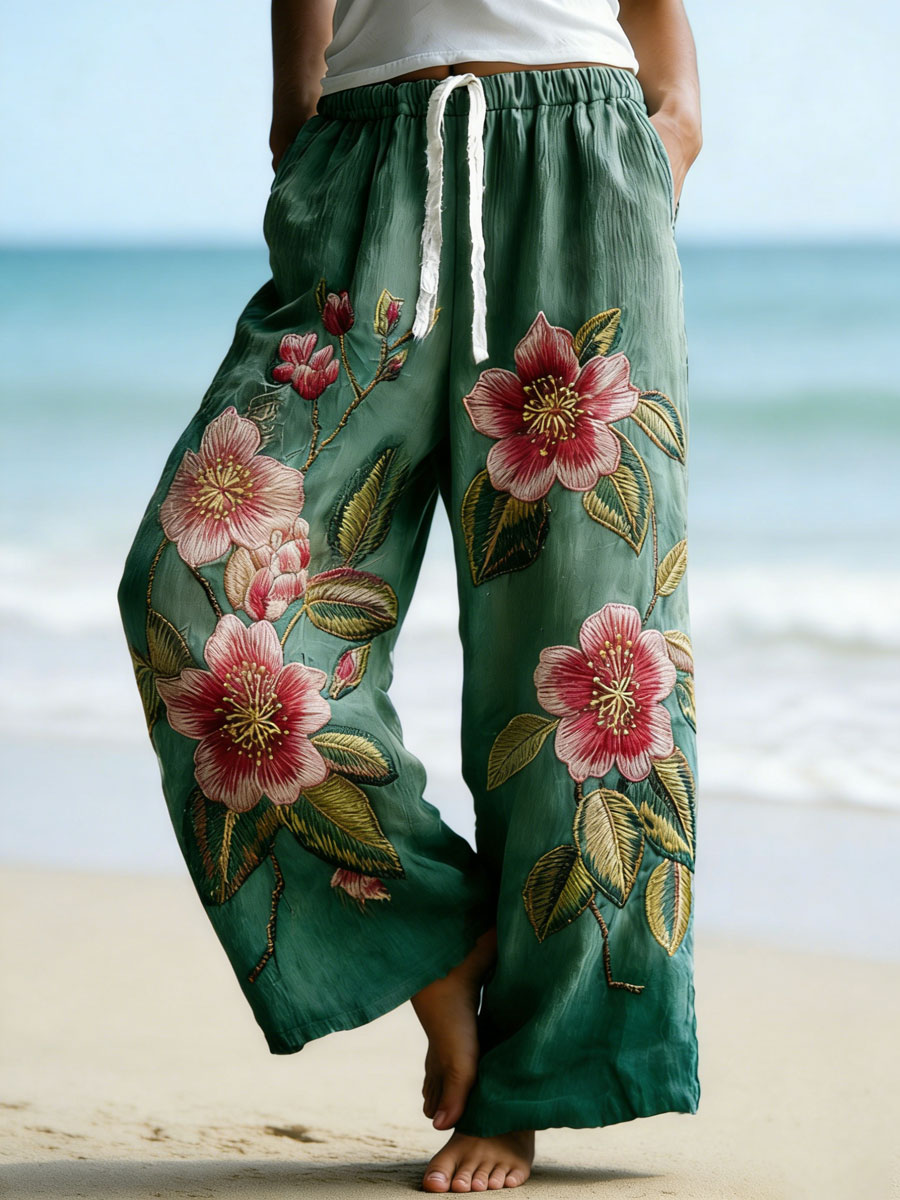 Pantalones de mezcla de lino con estampado floral bordado para mujer