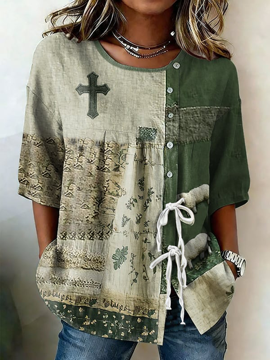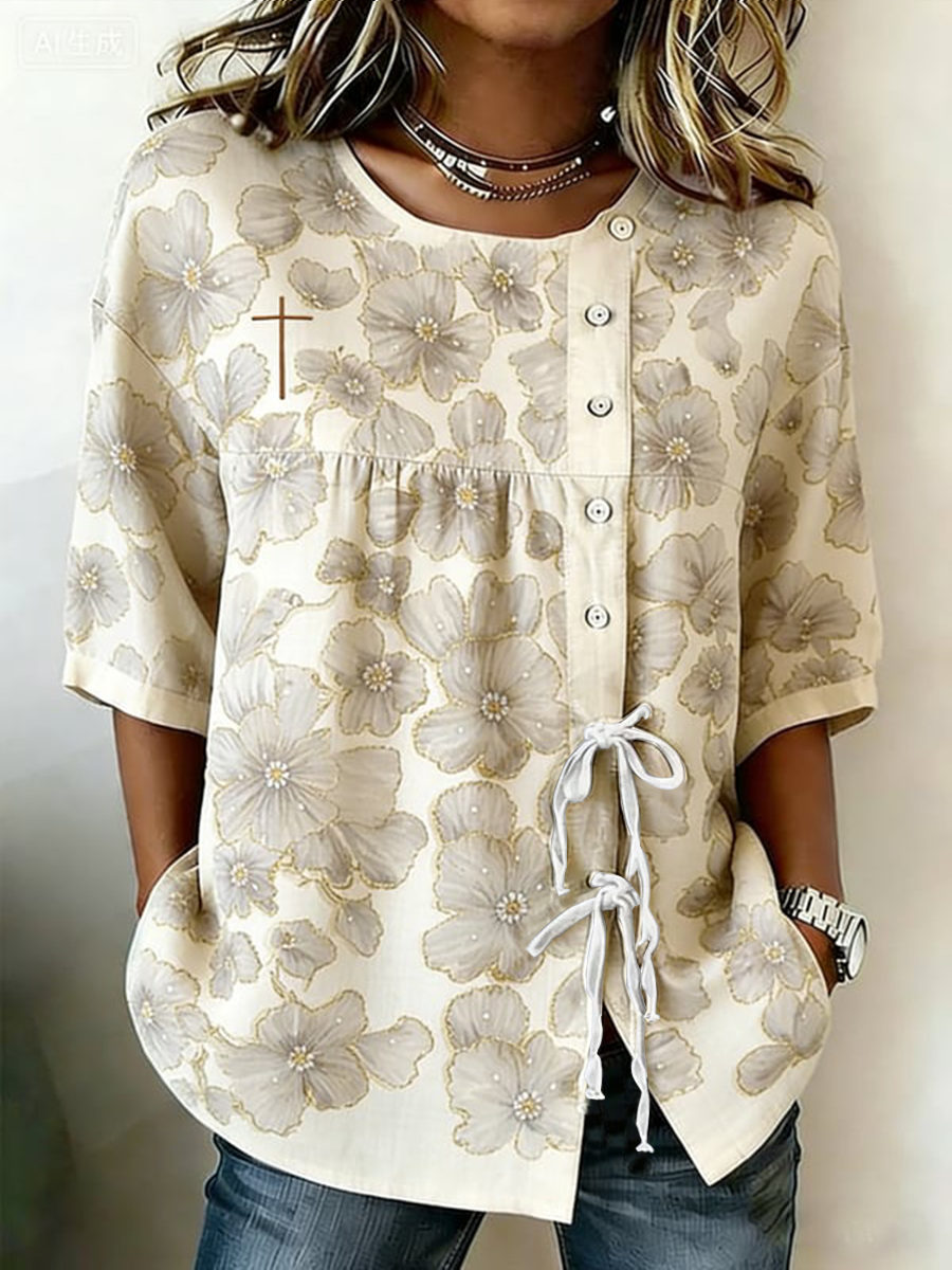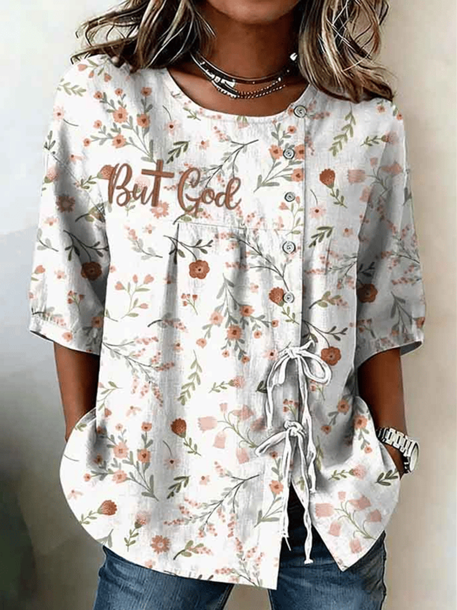 Camisa de algodón y lino con correa de botón de flor de fe para mujer