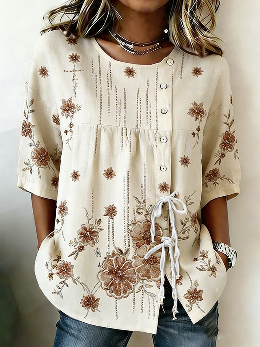 Camisa de algodón y lino con correa de botón de flor resucitado para mujer