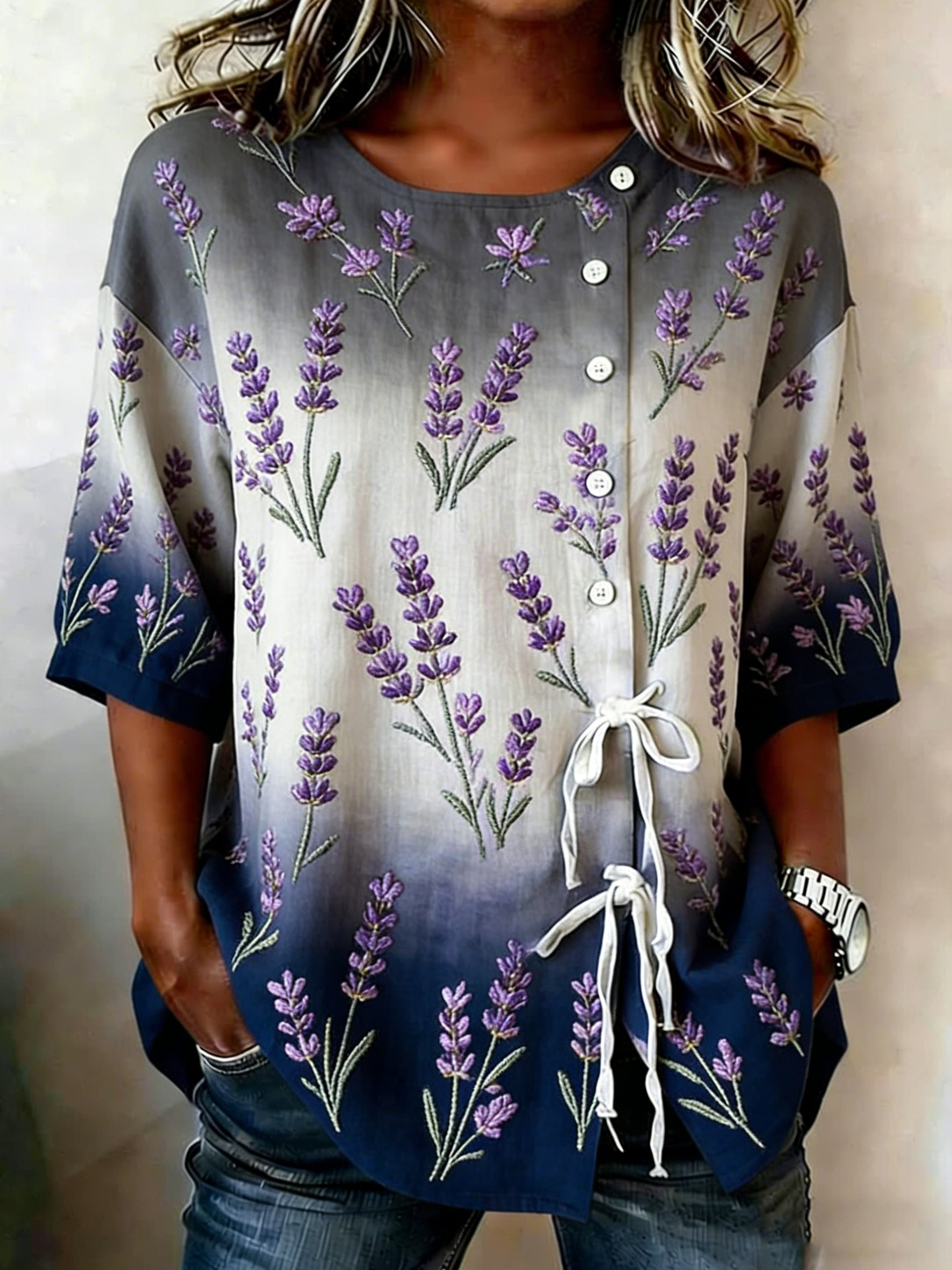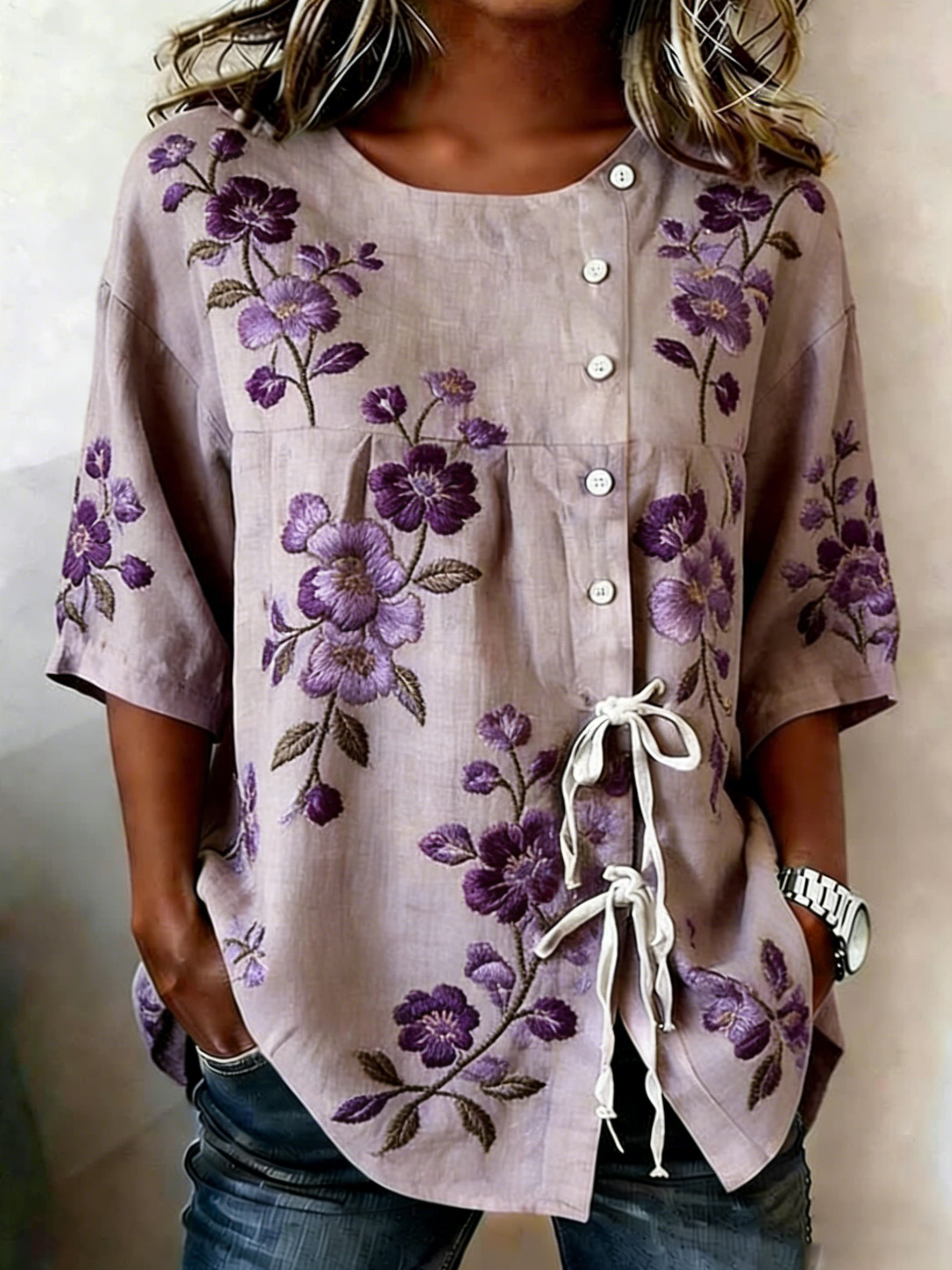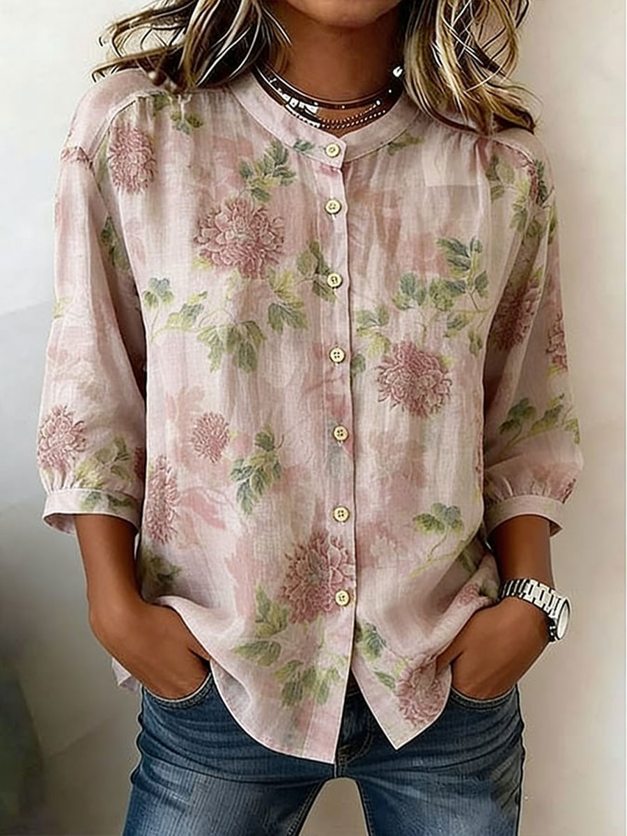 Camisa de mezcla de lino con botones y estampado floral para mujer