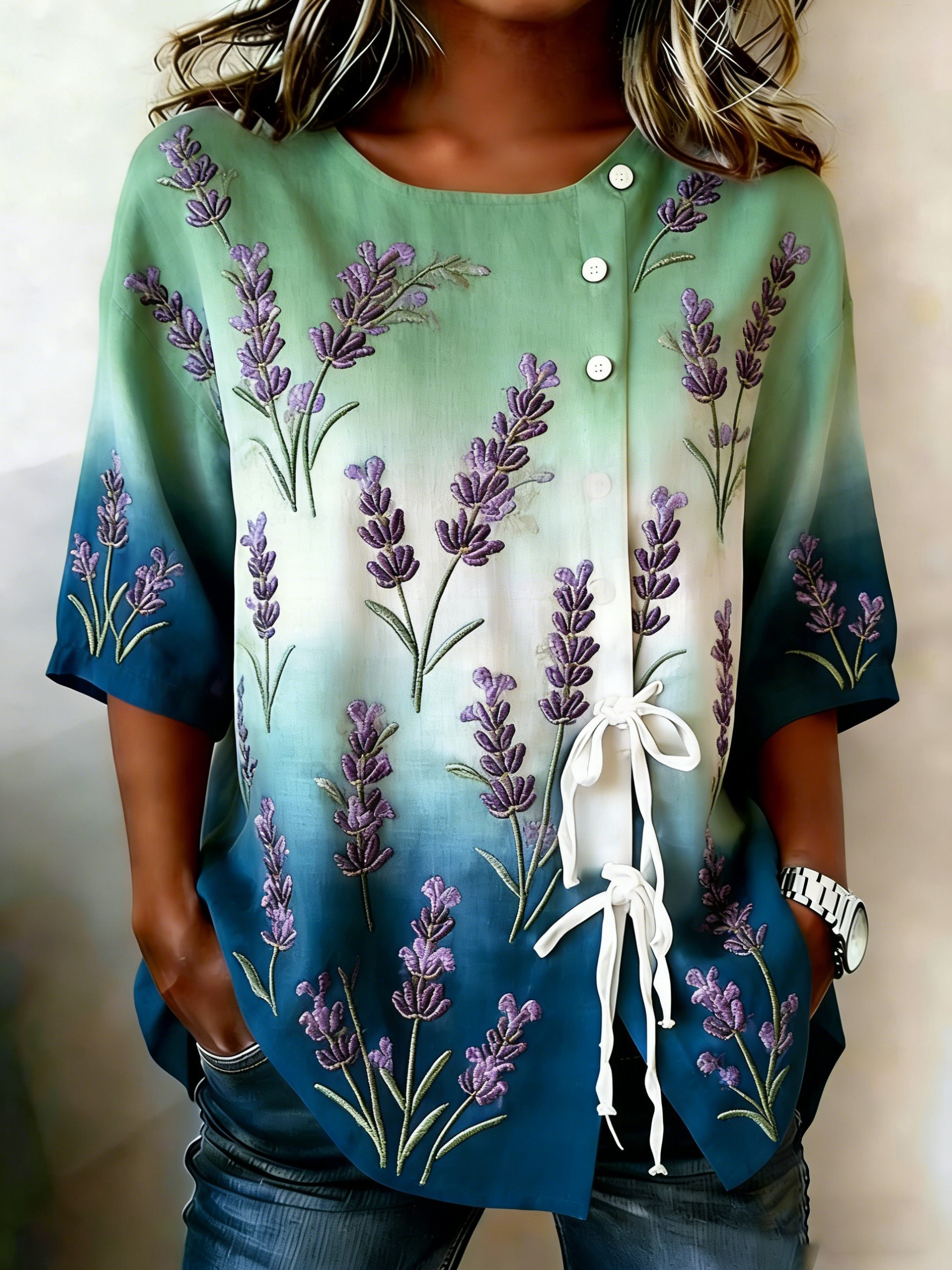 Camiseta Casual Floral Algodón Lino-Mujer