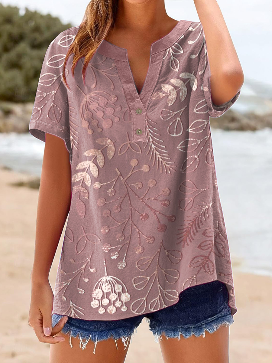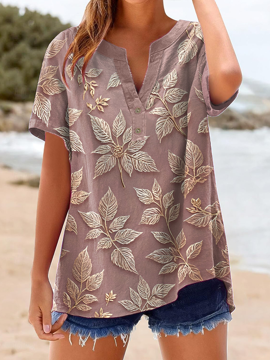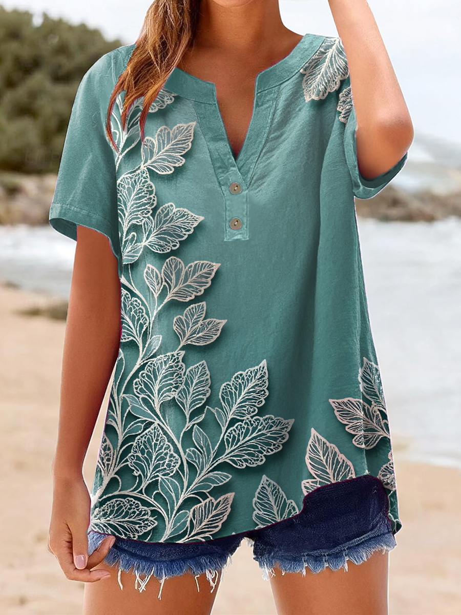 Camisa de lino vintage con estampado de arte de hoja para mujer