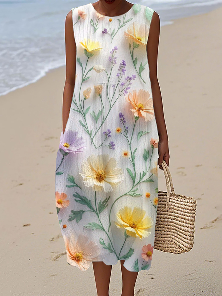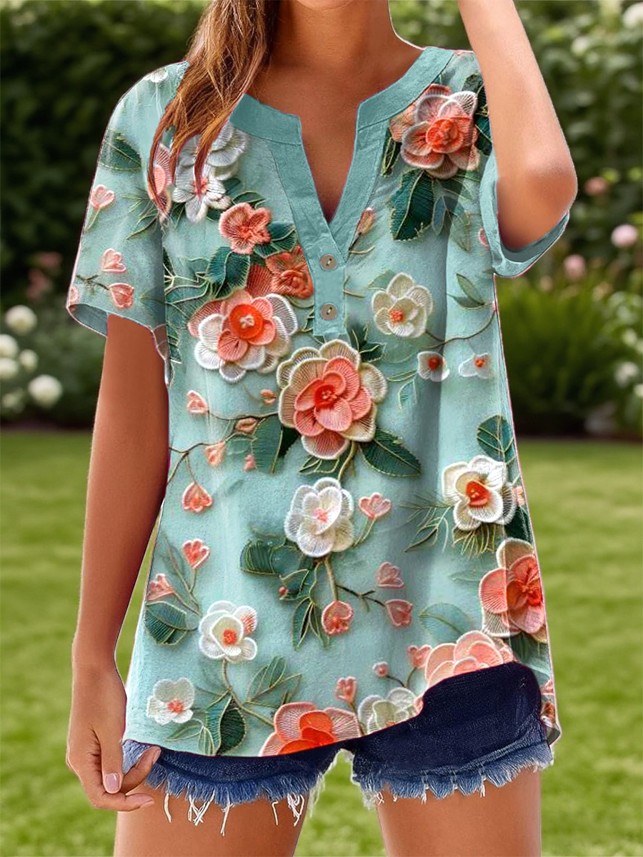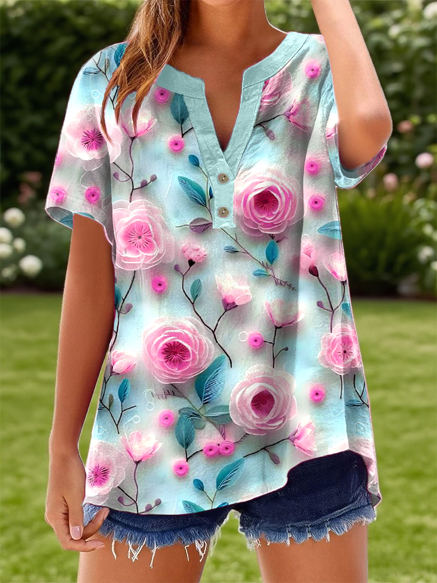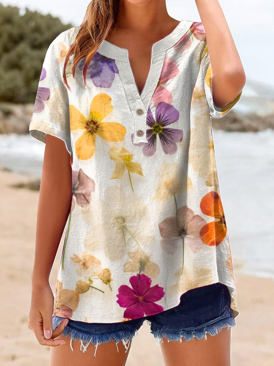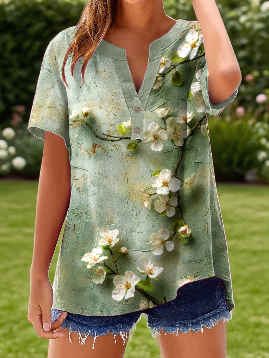 Camisa de lino con estampado de arte floral floreciente para mujer