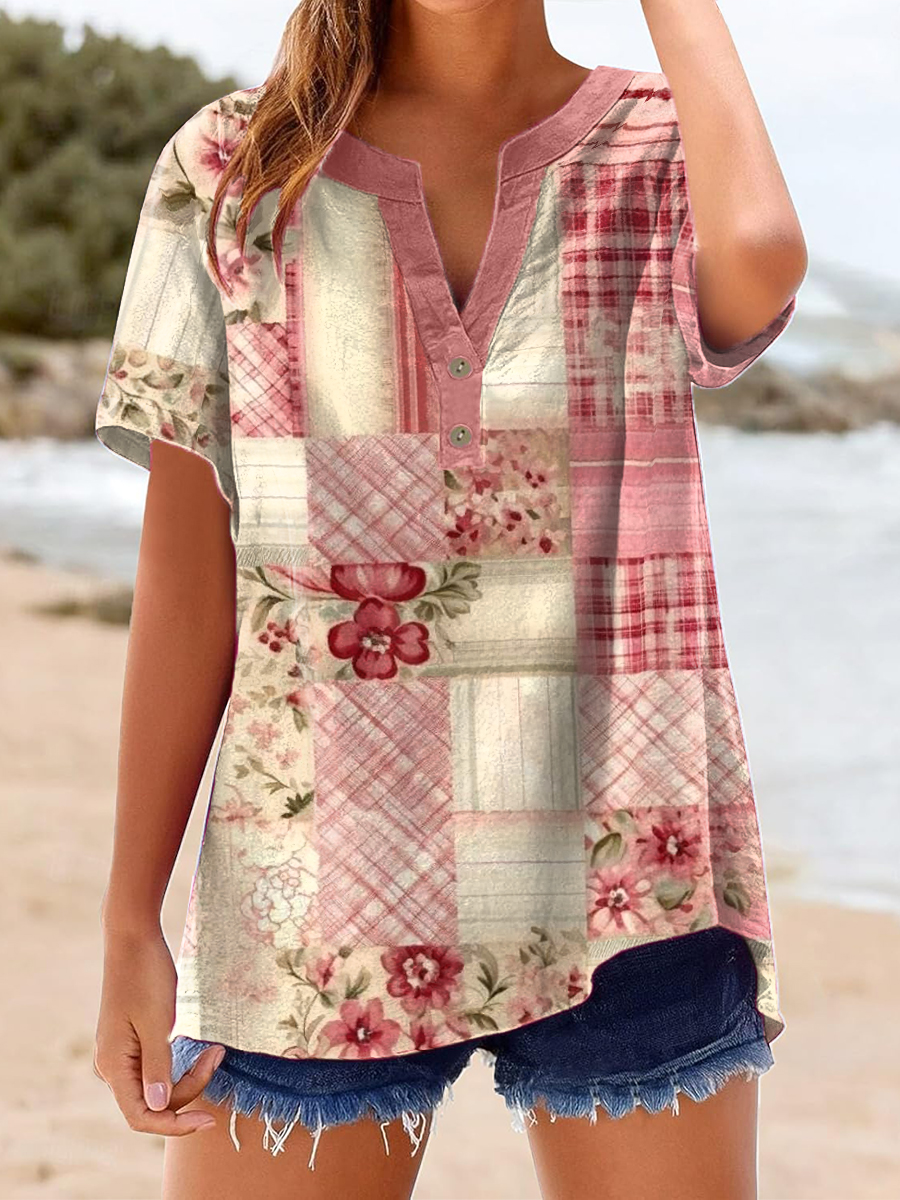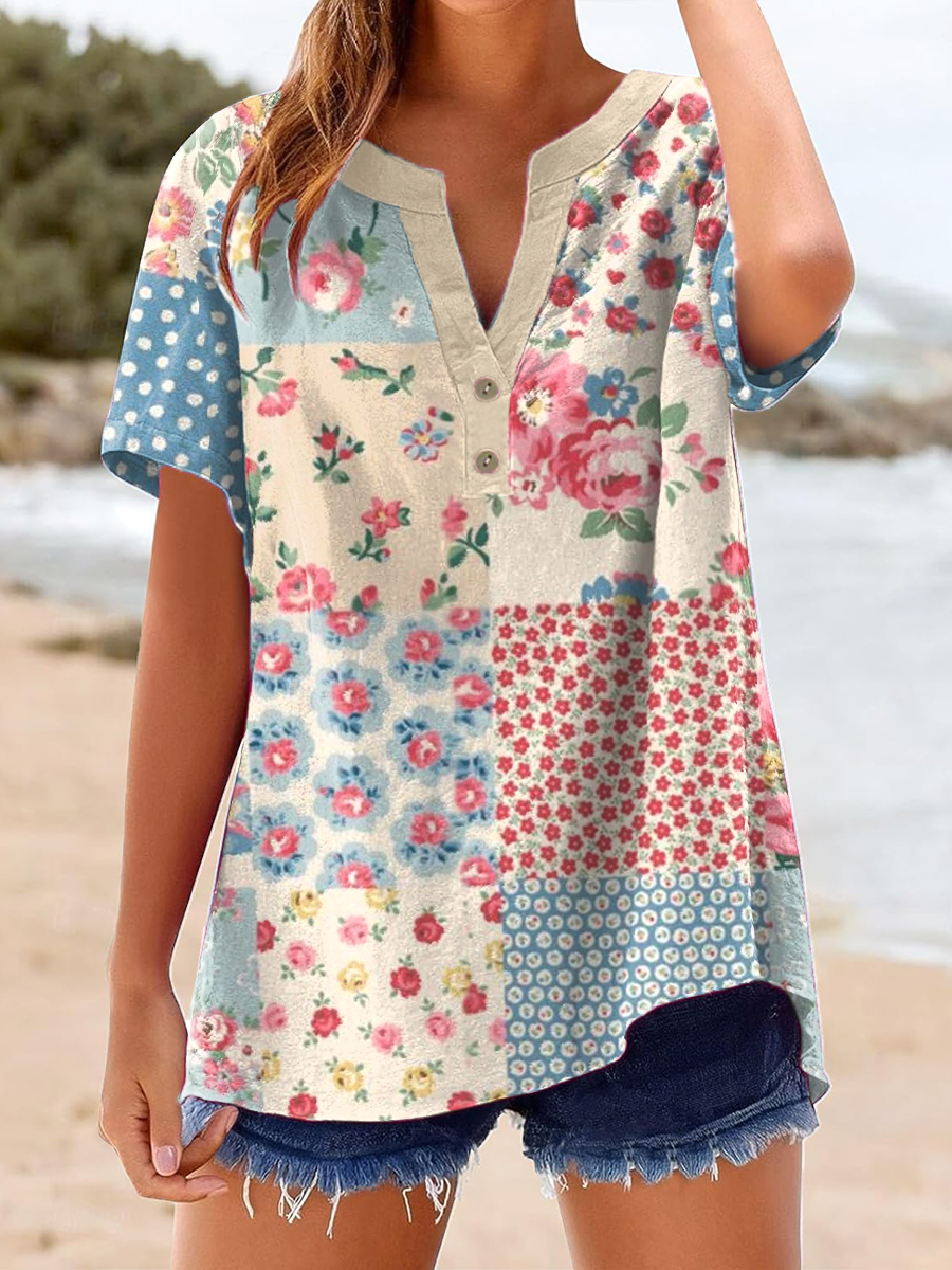 Camisa de lino del arte del remiendo floral de la vendimia de las mujeres