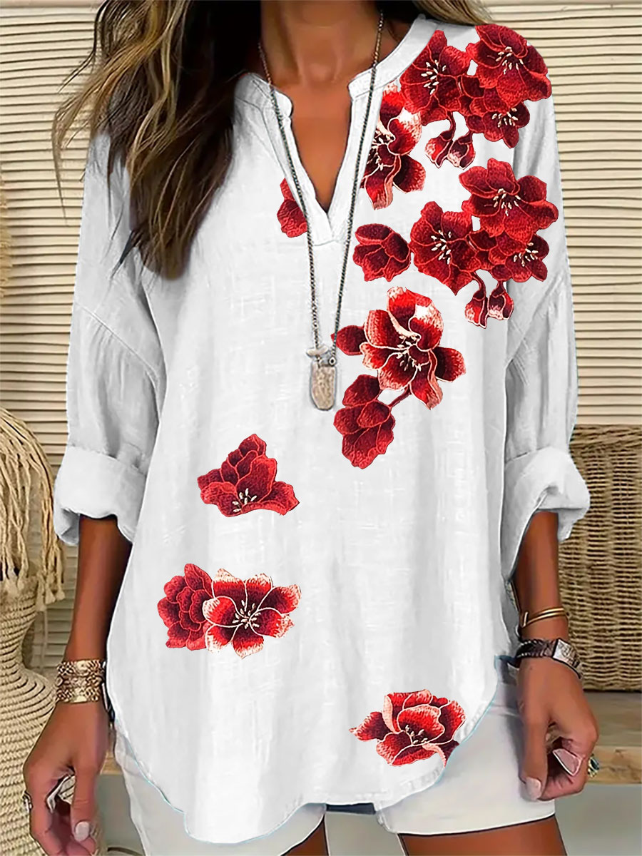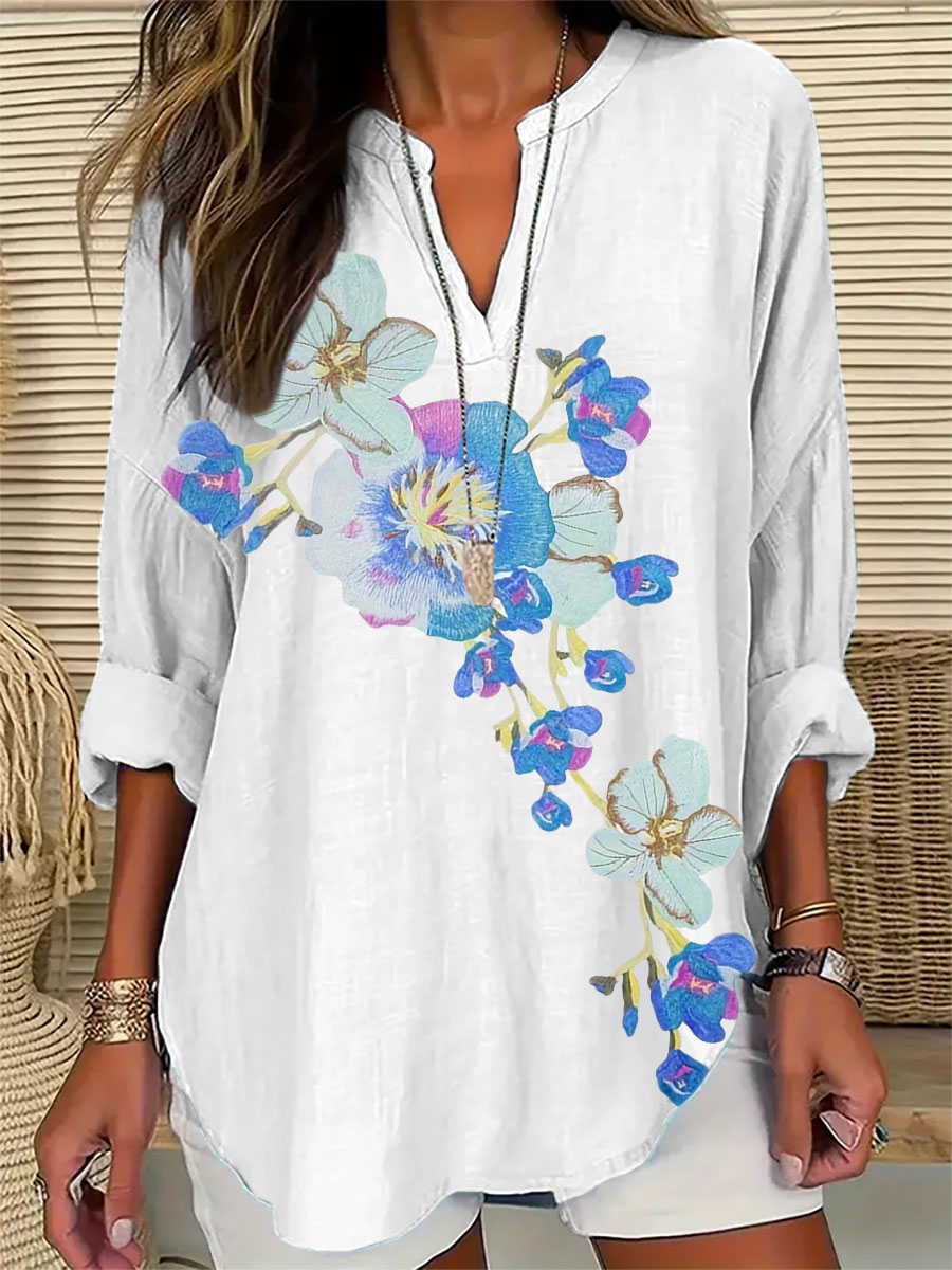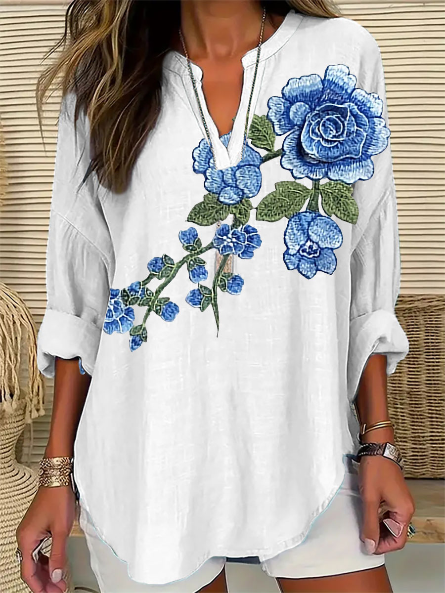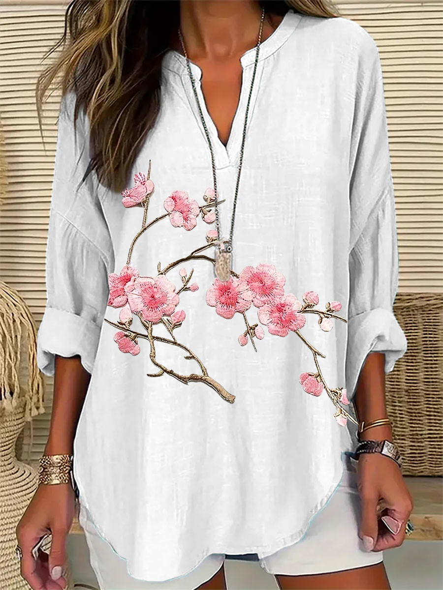 Camisa de lino elegante de la impresión del arte floral de las mujeres