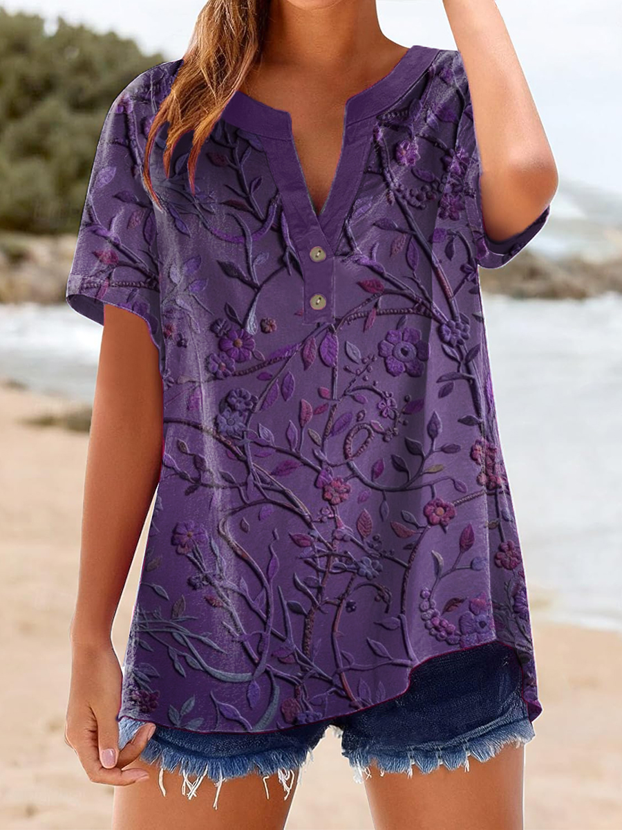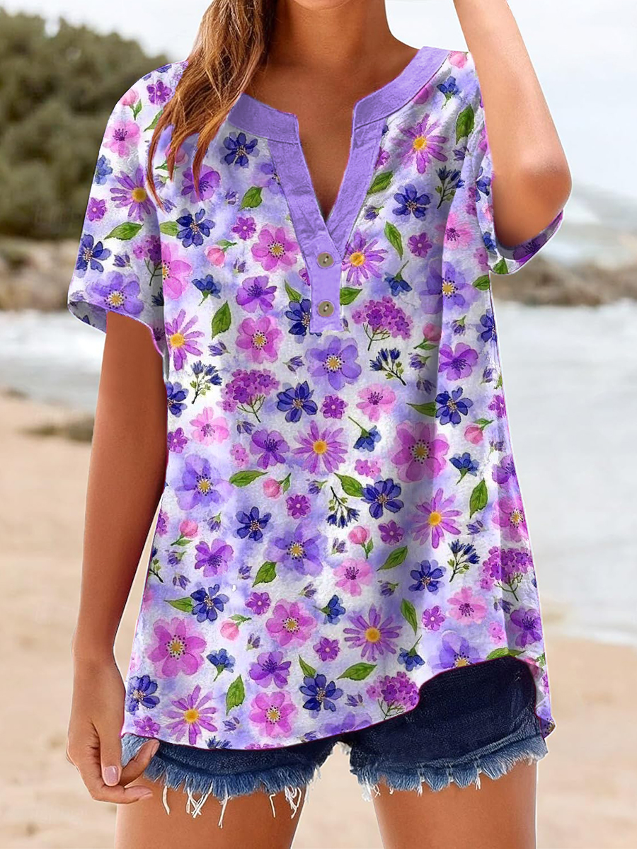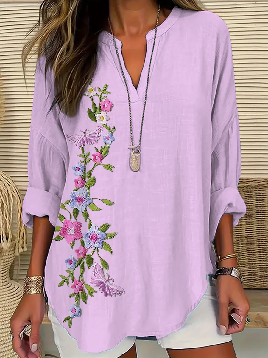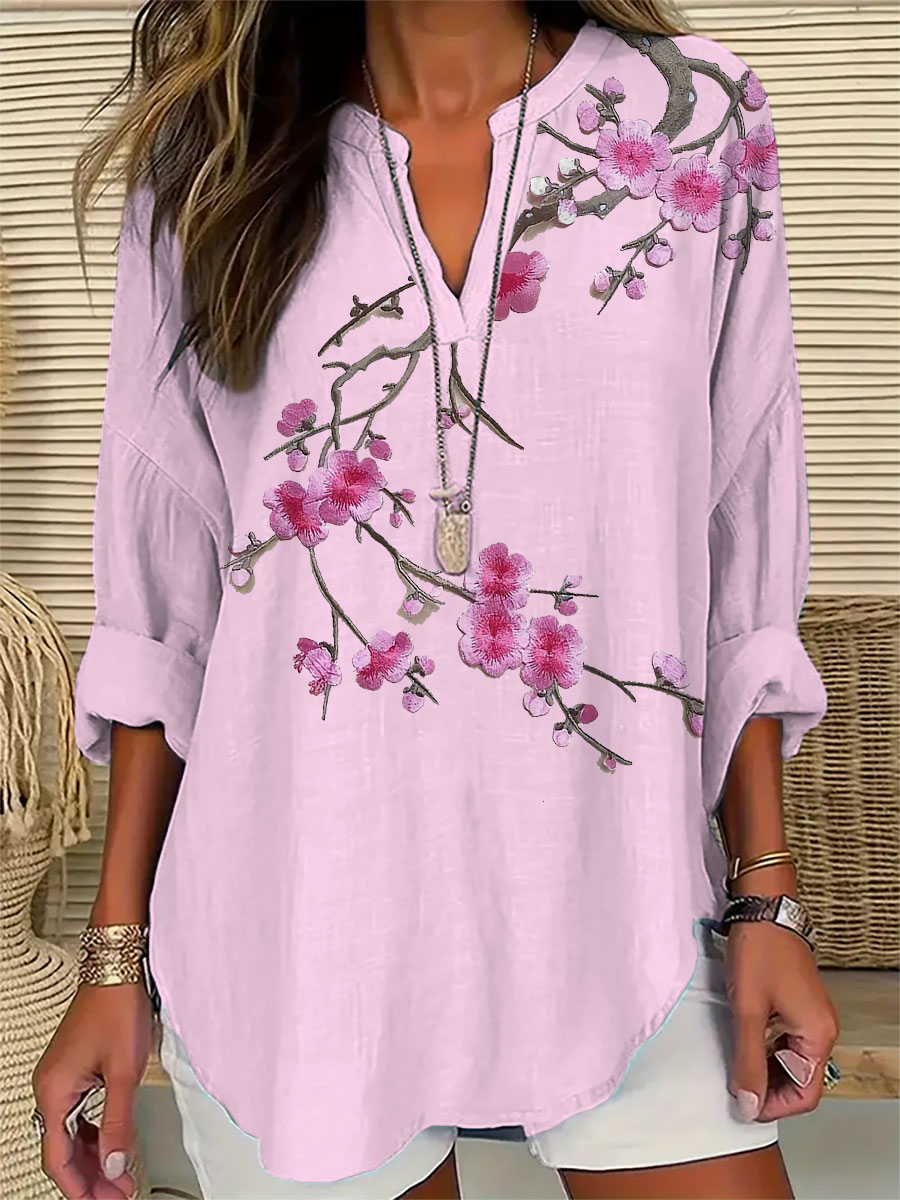 Camisa de lino con estampado floral púrpura vintage para mujer