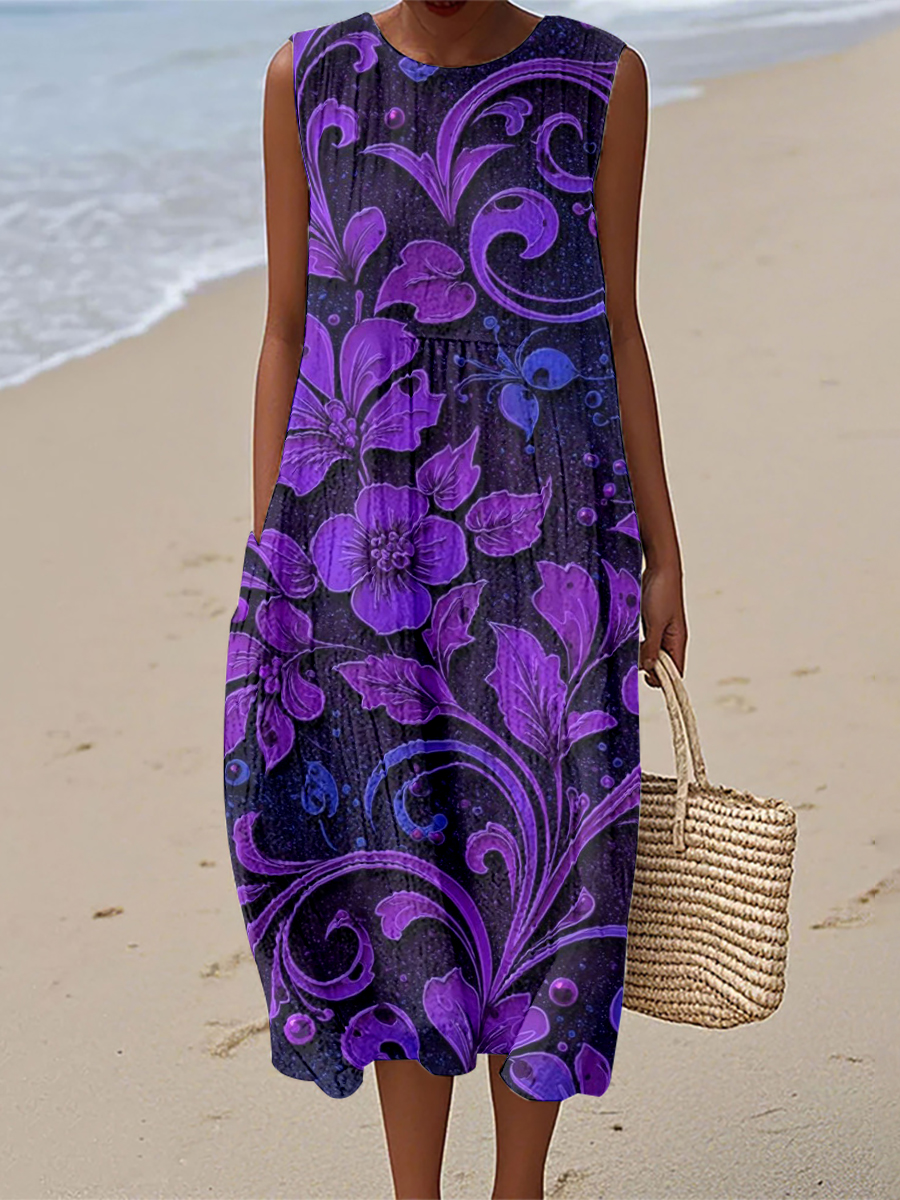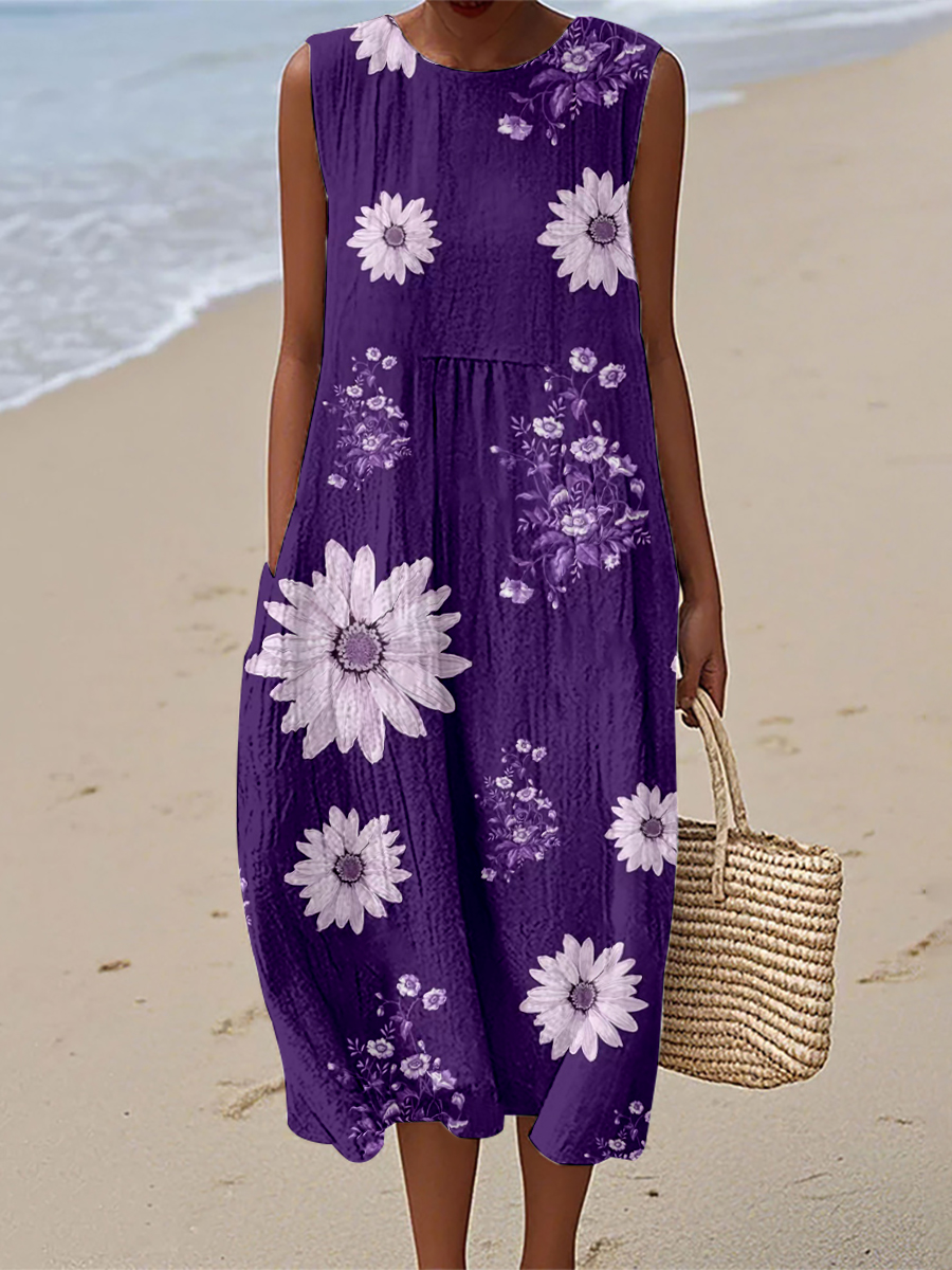 Vestido de lino con estampado floral púrpura vintage para mujer