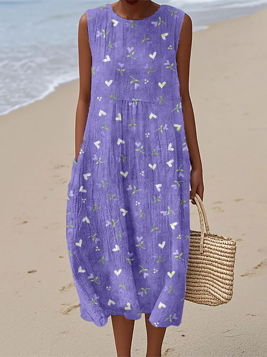 Vestido de lino de estampado floral de corazón púrpura de mujer