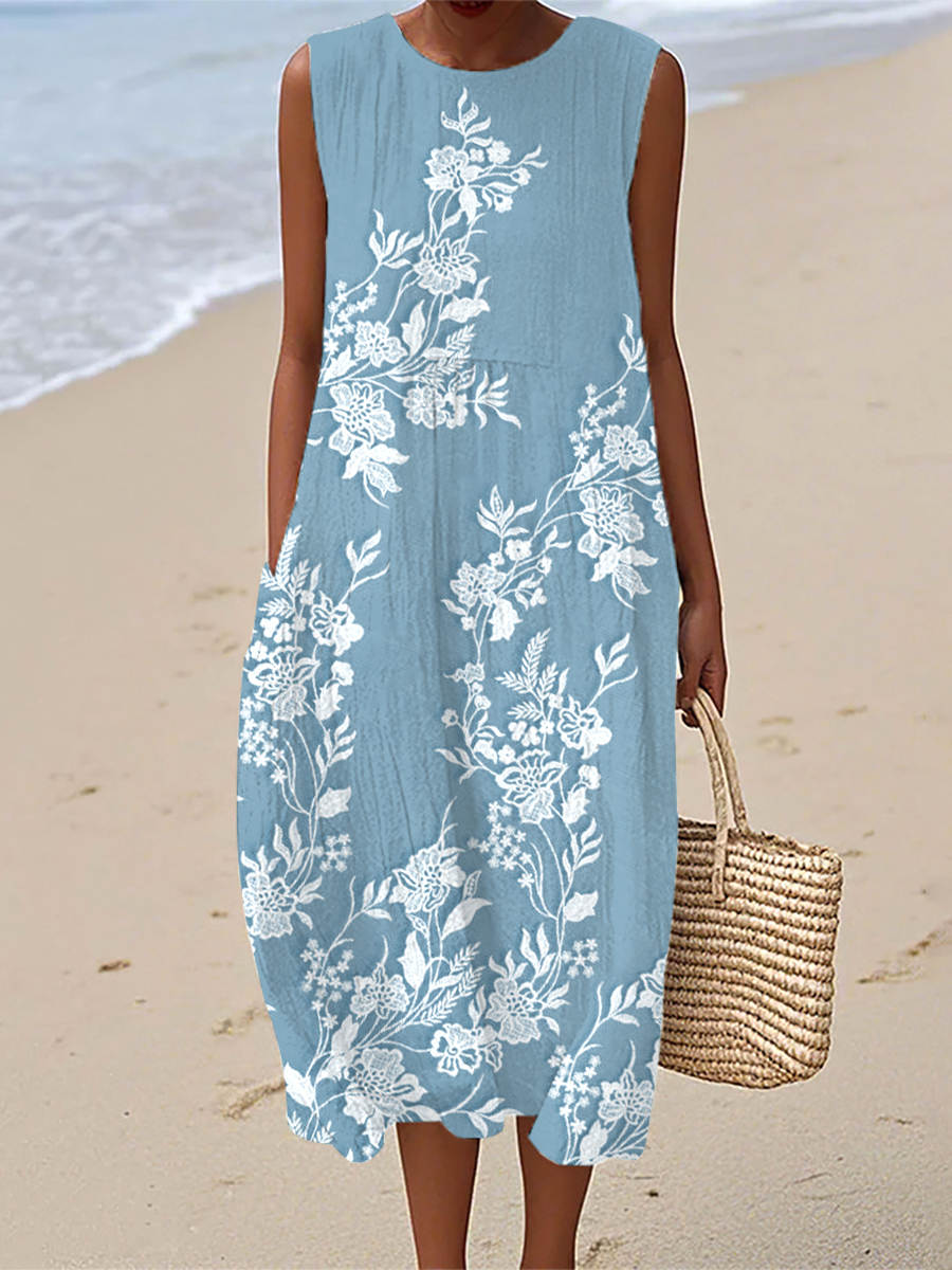 Vestido sin mangas de lino con encaje y estampado floral para mujer