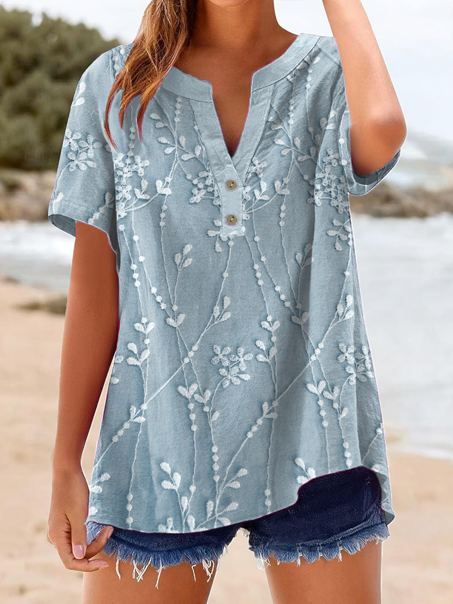 Camisa de manga corta de lino con estampado floral de encaje para mujer