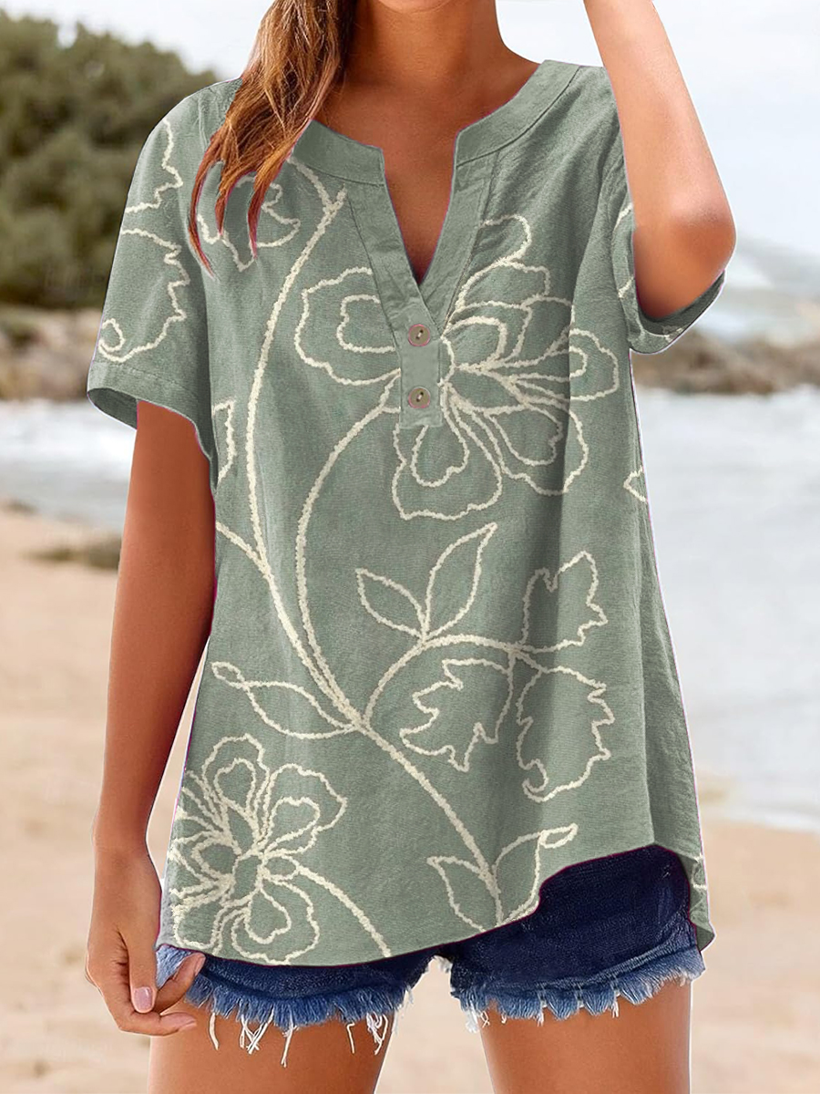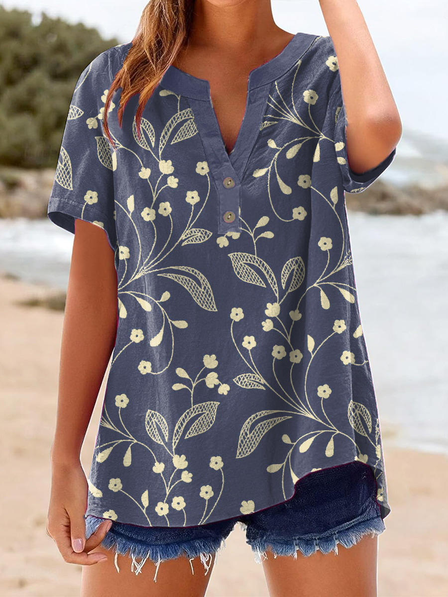 Camisa de manga corta de lino con estampado floral vintage para mujer