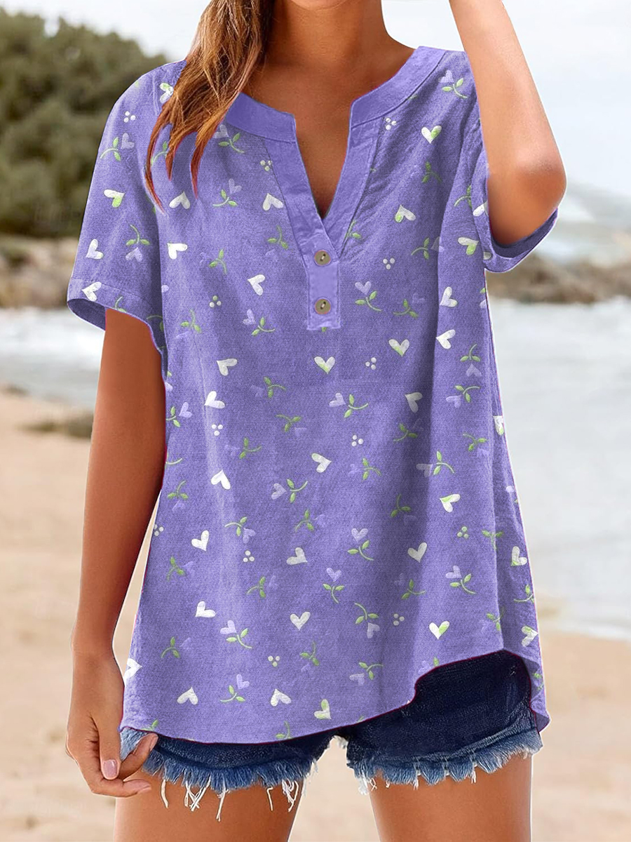 Camisa de lino con estampado floral y corazón púrpura para mujer