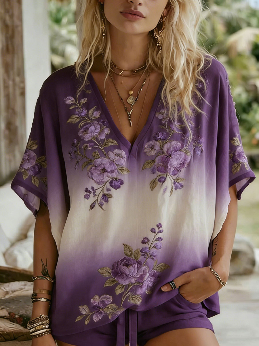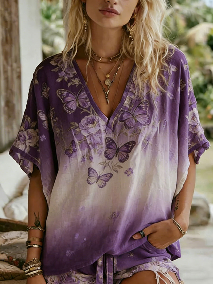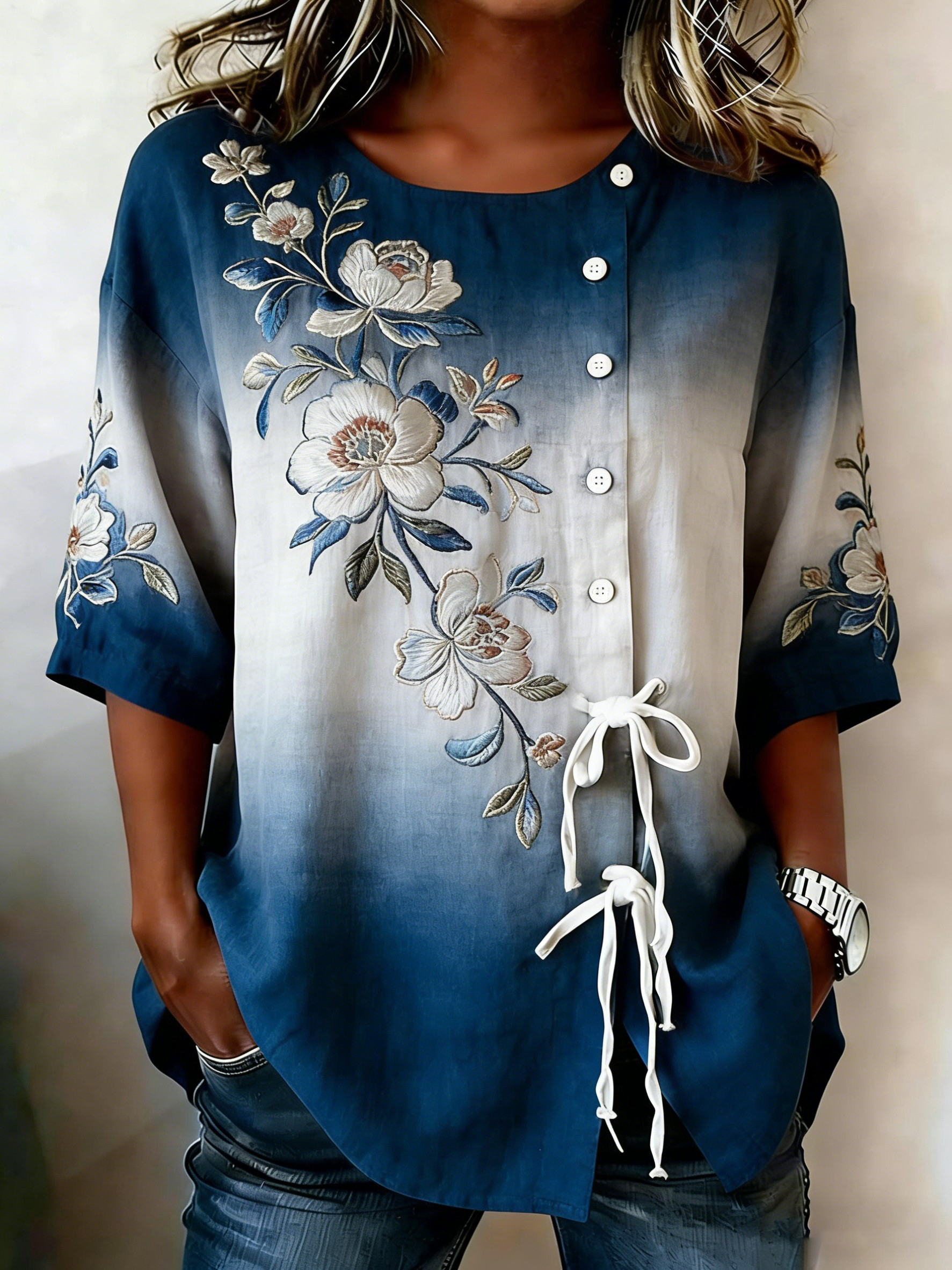 Camisa de mujer con cuello en V, mezcla de lino y estampado floral