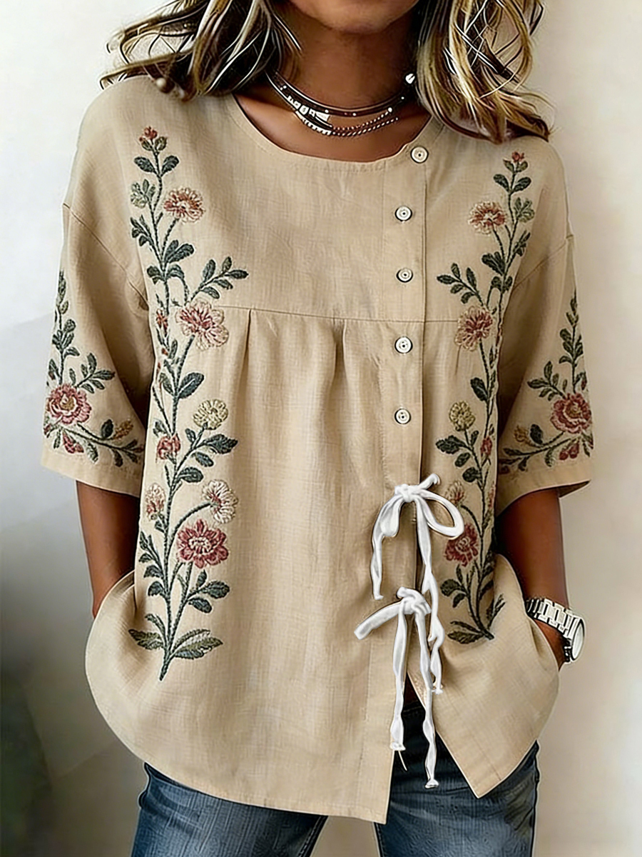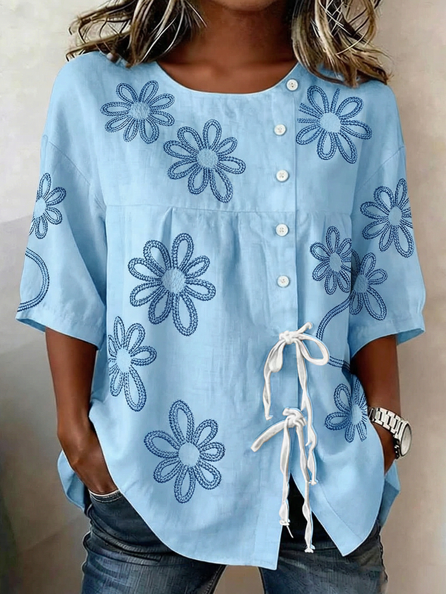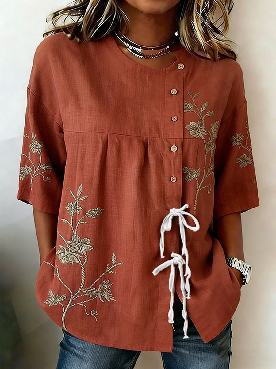 Camisa de mezcla de lino con botones y cordones de plantas y flores para mujer