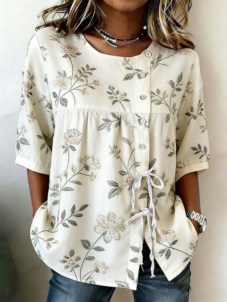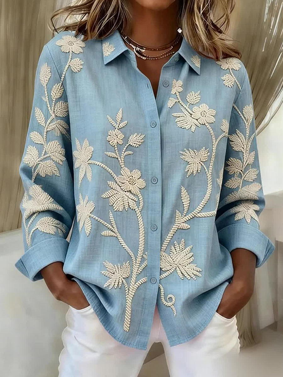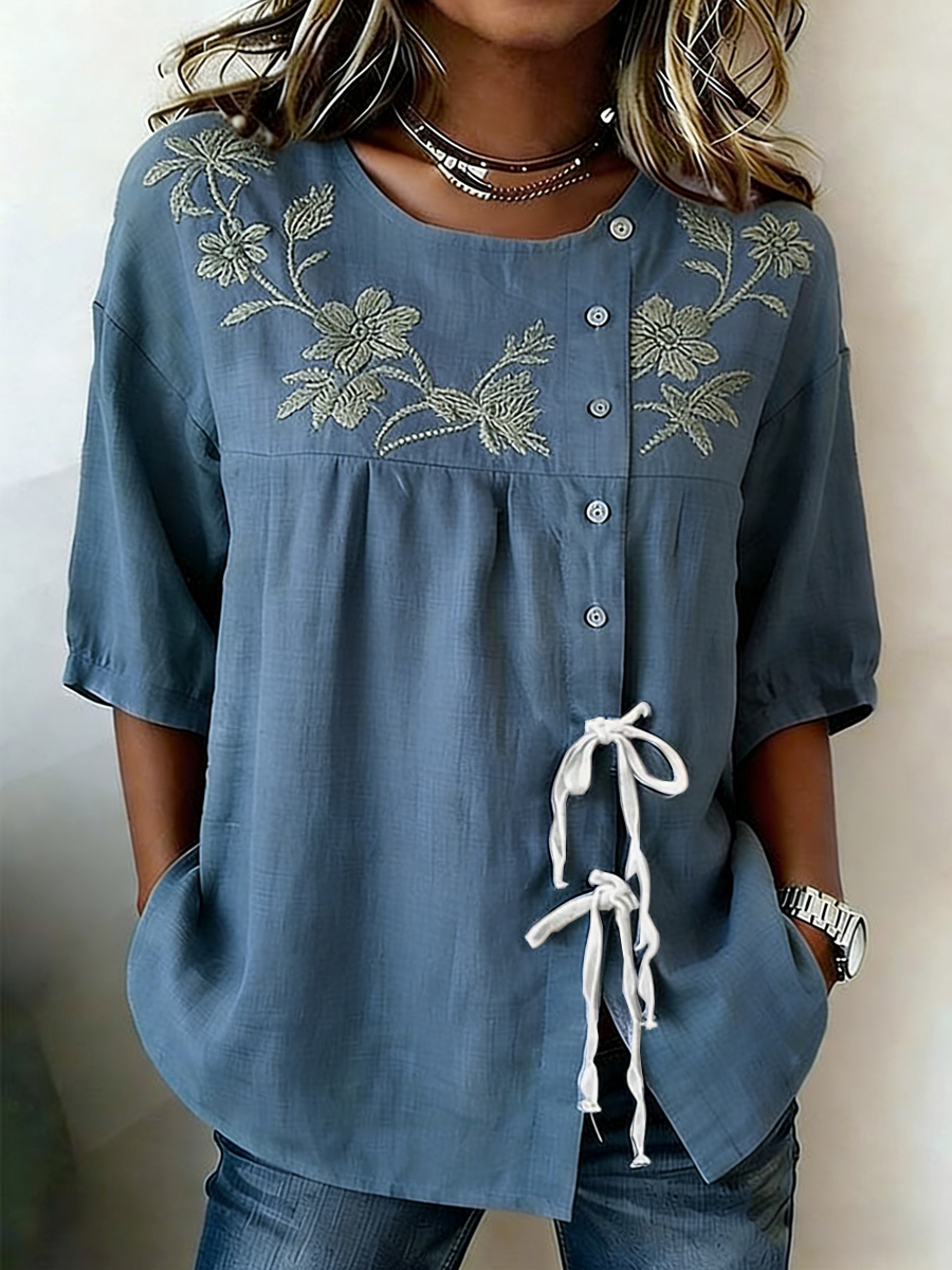 Camisa de mezcla de lino con botones y cordones de plantas y flores para mujer