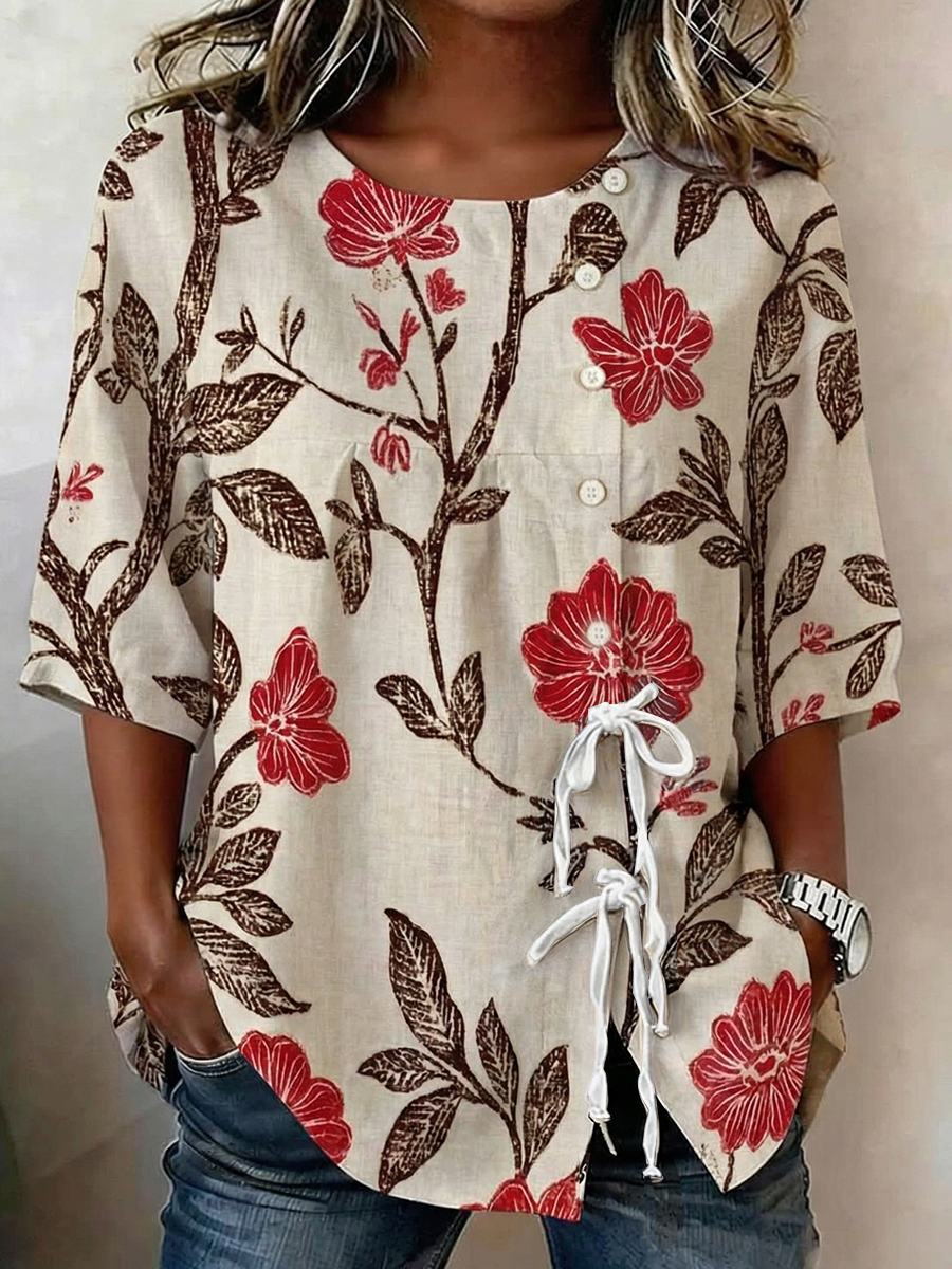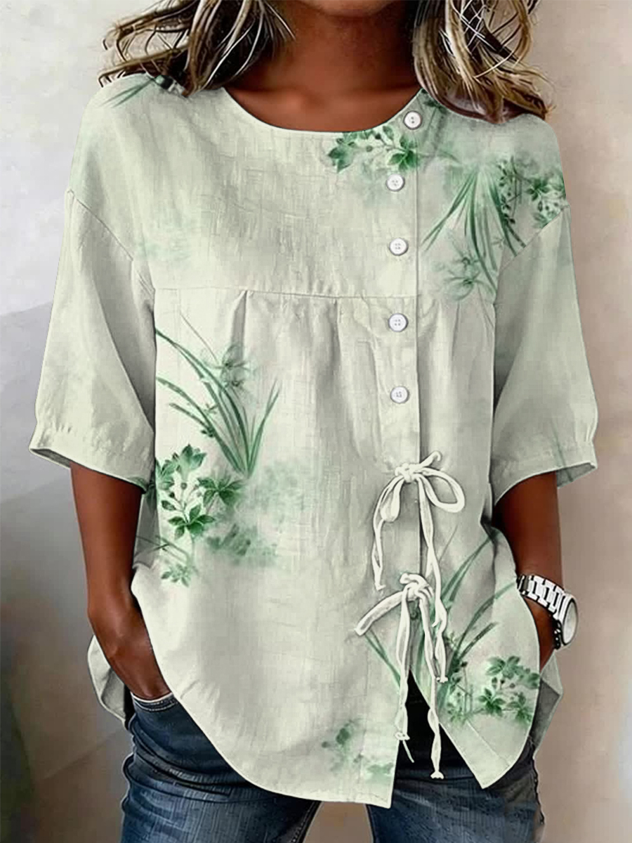 Camisa de mezcla de lino con botones y cordones, estampada con plantas y flores, para mujer