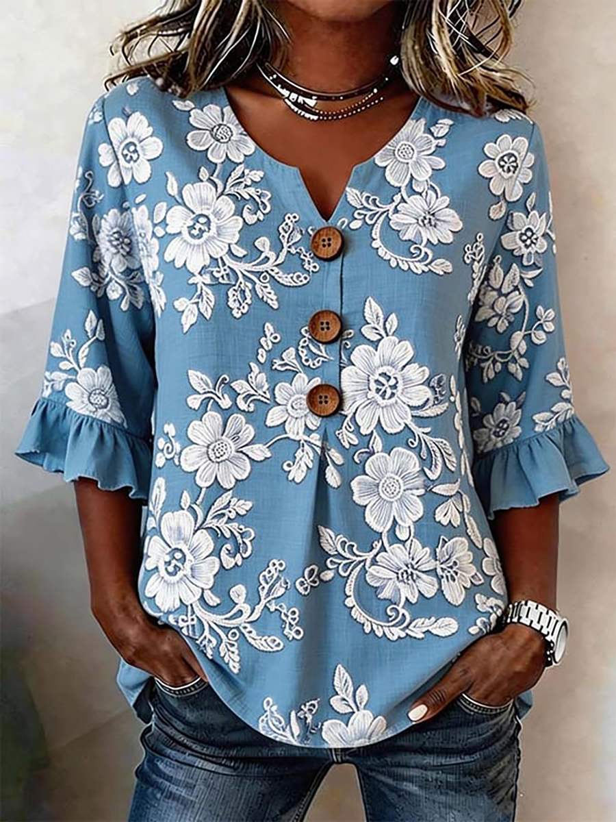 Camisa de lino floral casual para mujer