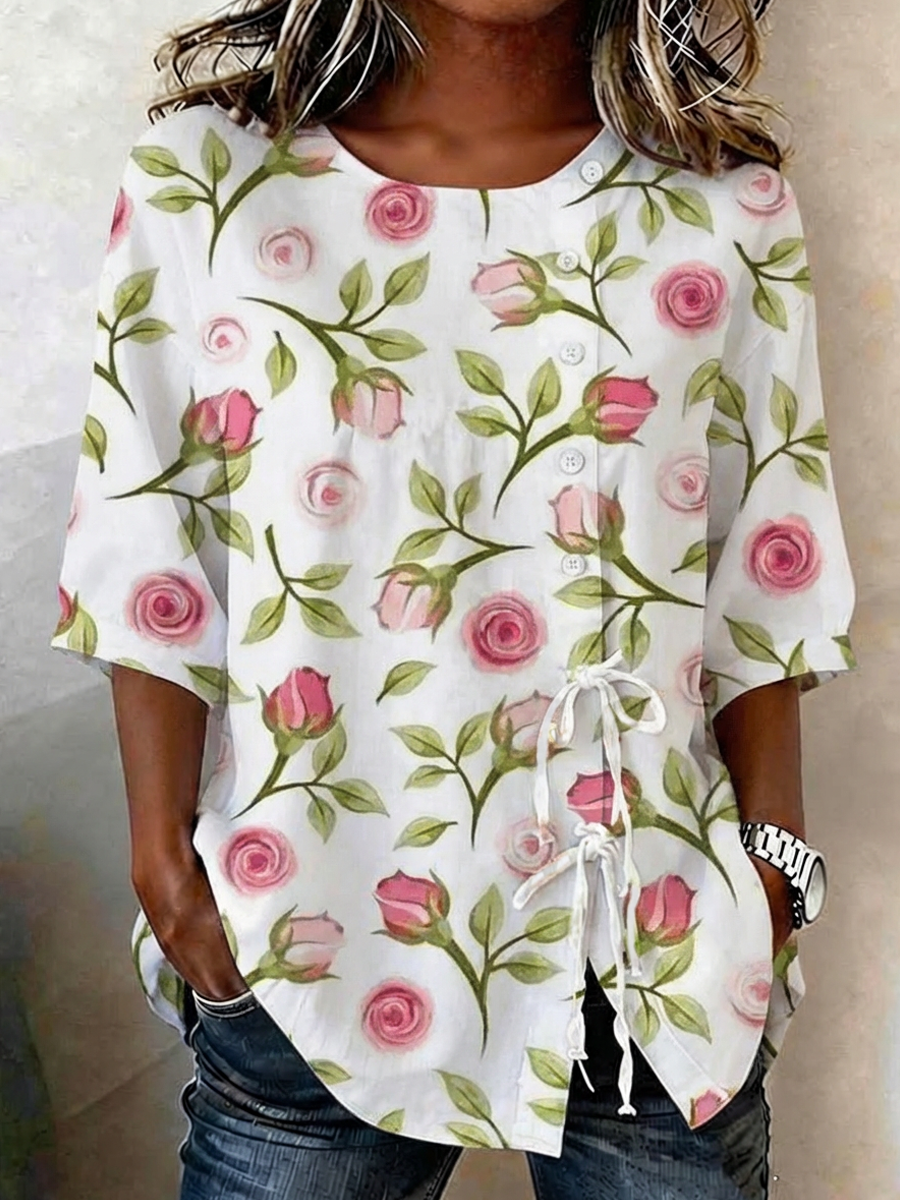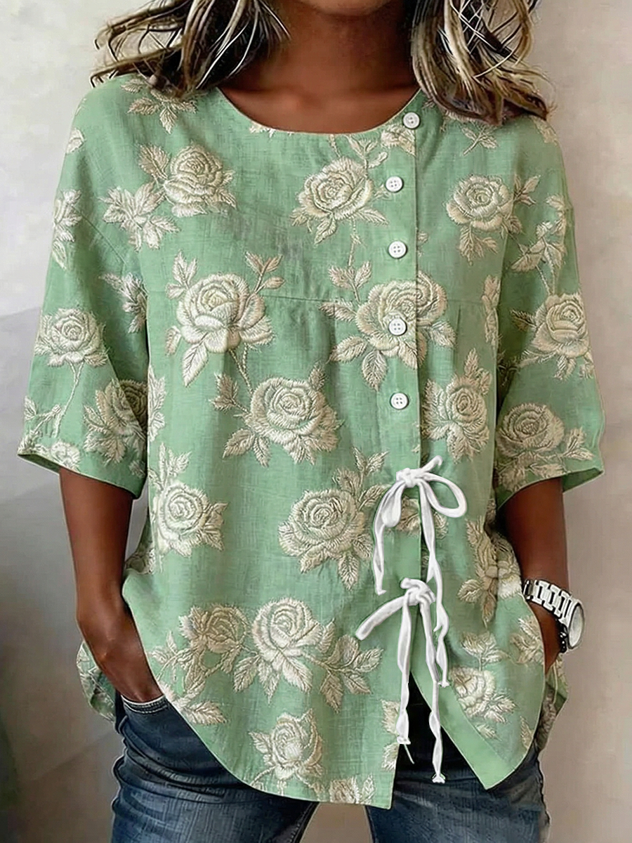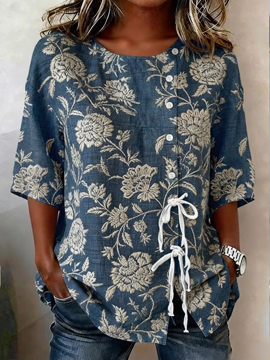 Camisa de mezcla de lino con botones y cordones, estampada con plantas y flores, para mujer
