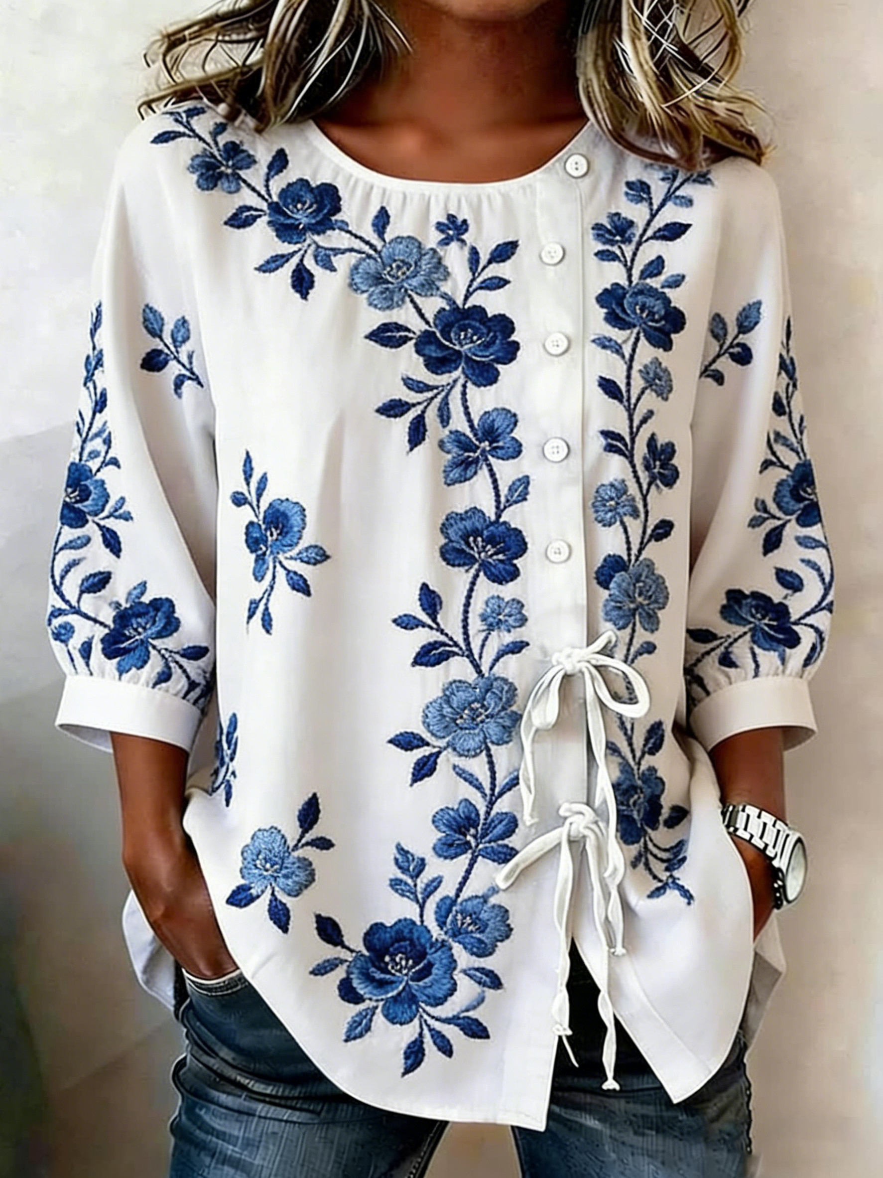 Camisa de mezcla de lino con botones y estampado floral para mujer