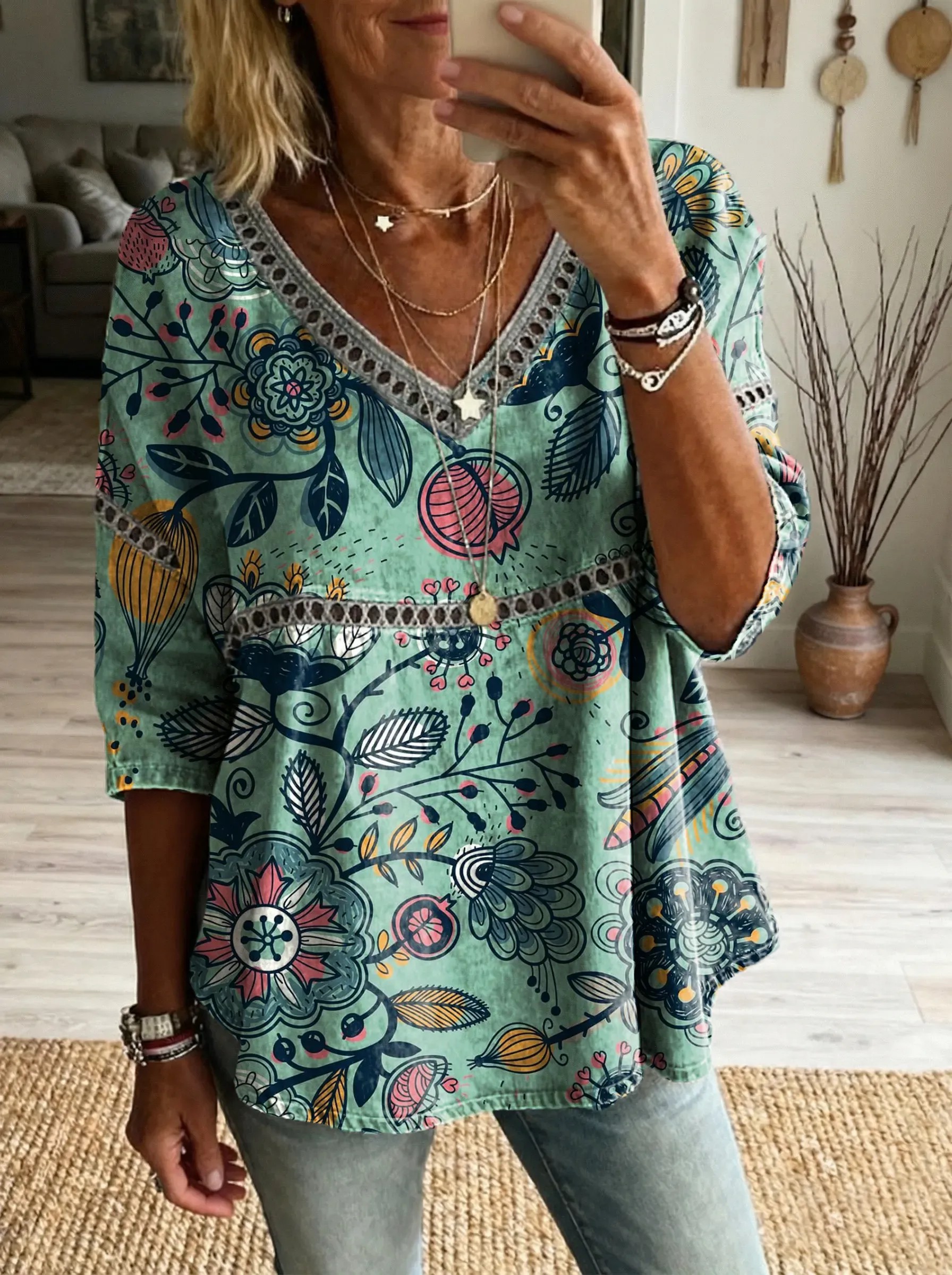 Estampado de arte de estampado floral de las mujeres con cuello en v con cordones top