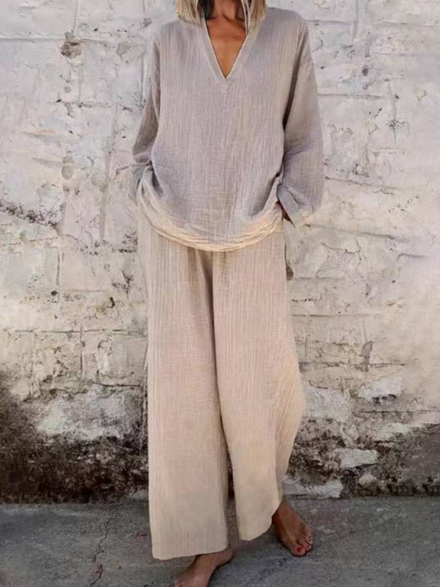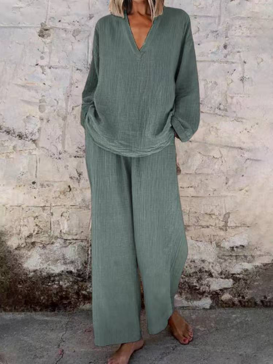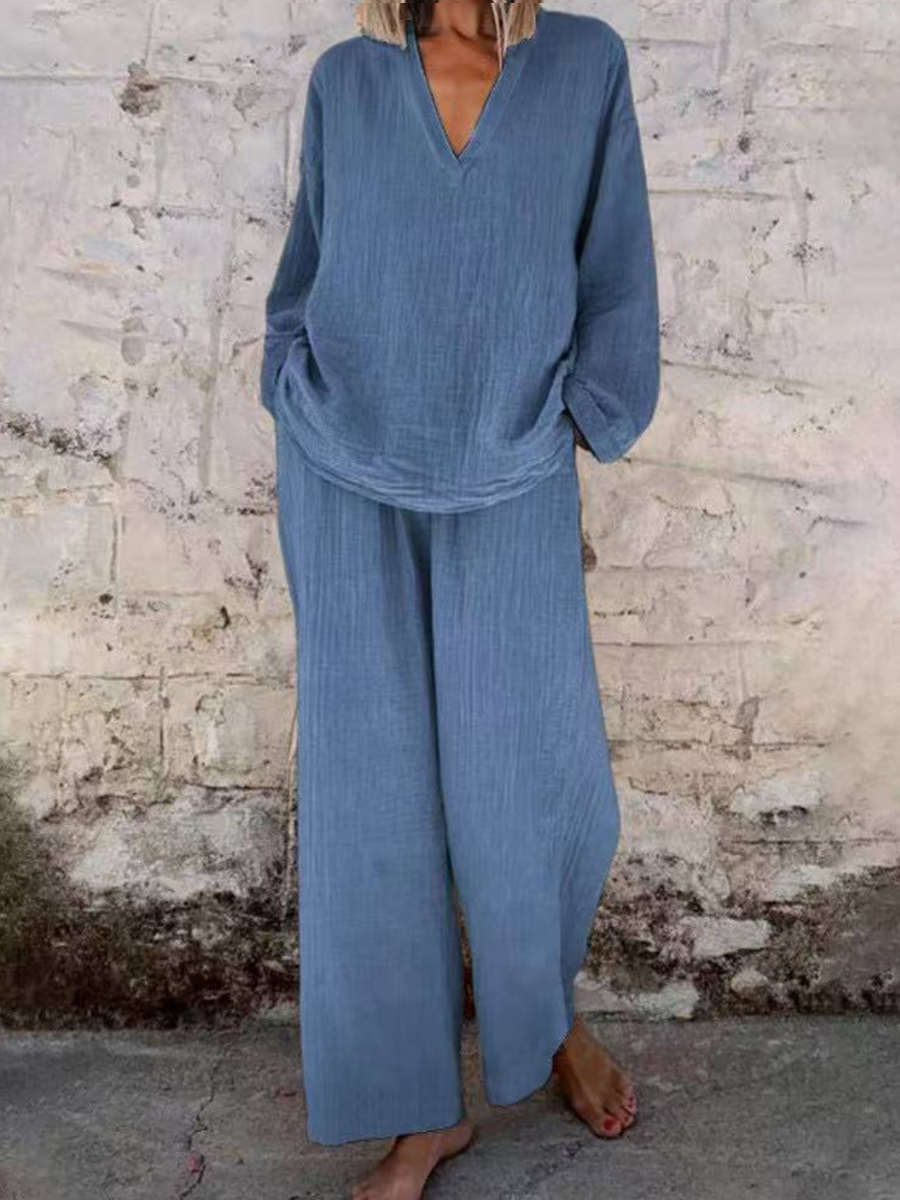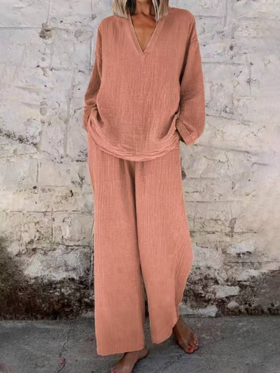 Mujeres Casual V-Meck Pullover manga larga con bolsillos pantalones traje