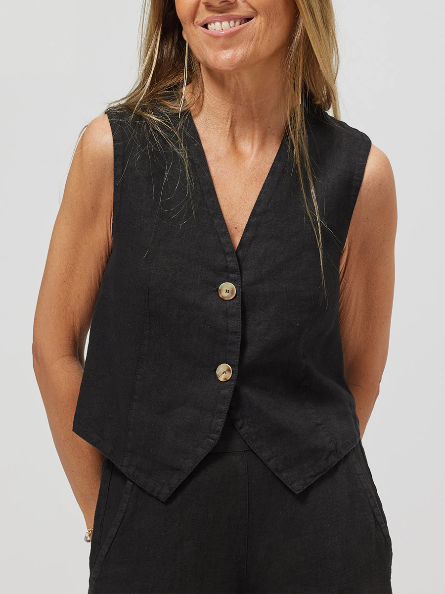 Traje casual de algodón y lino de color sólido de empalme de chaleco de moda para mujer