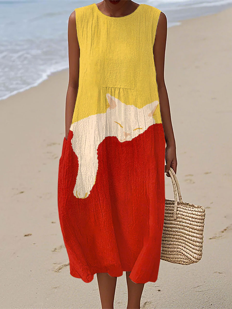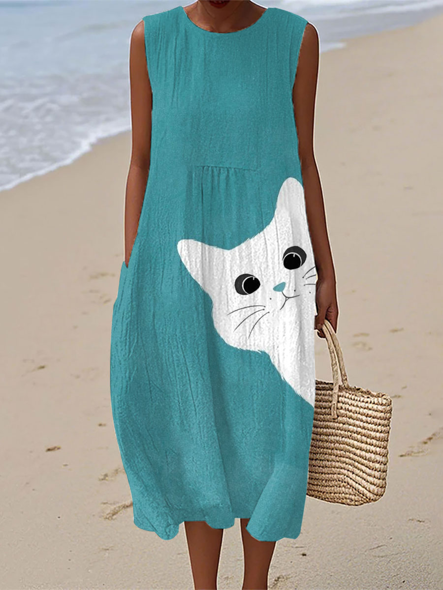 Vestido de lino con estampado artístico de gato para mujer