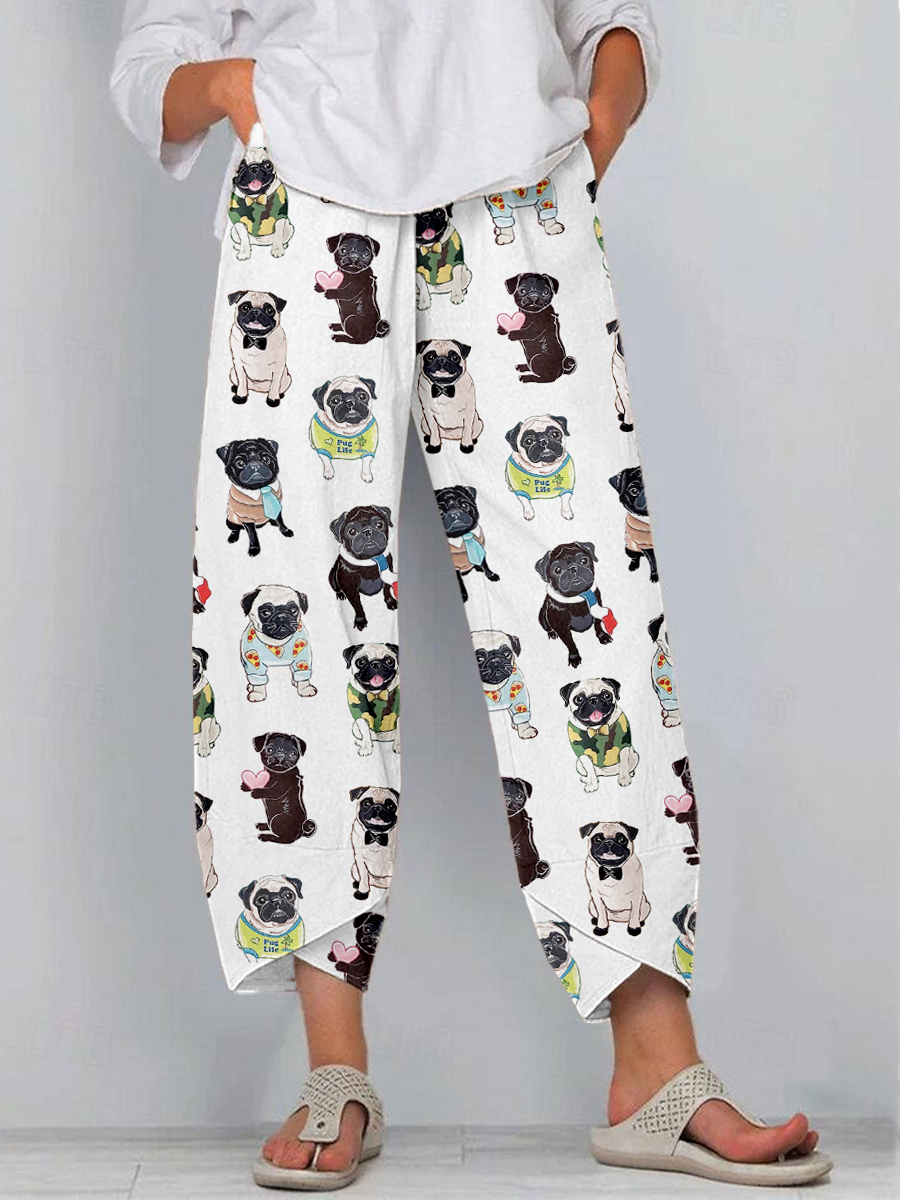 Pantalones de lino con estampado de pug lindo de mujer
